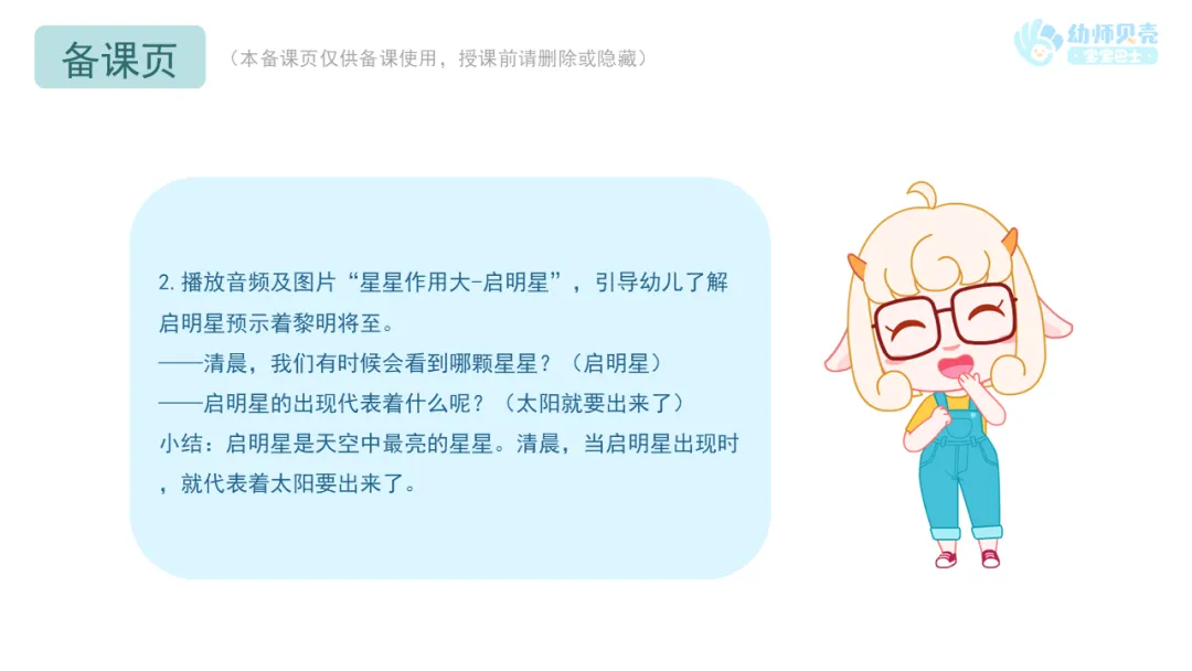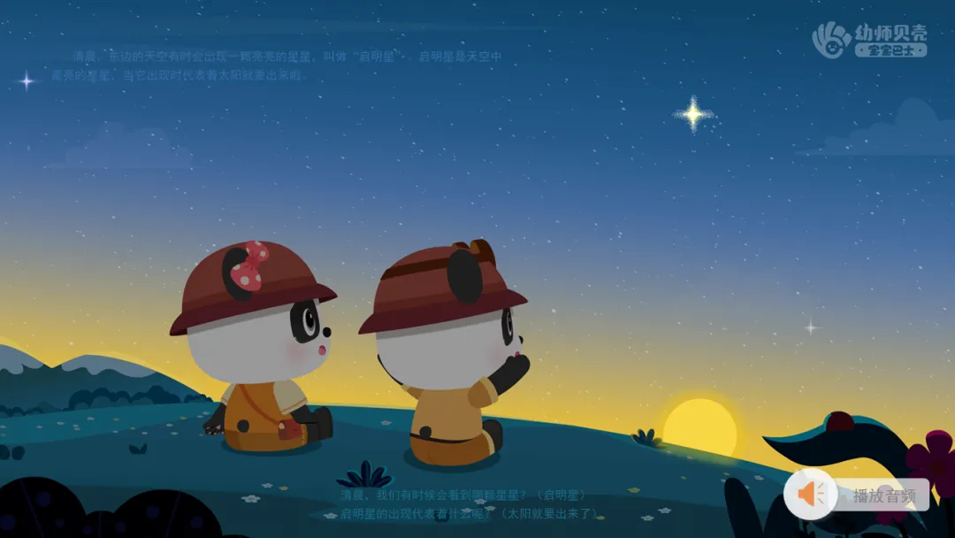 2.播放音频及图片“星星作用大-启明星”,引导幼儿了解启明星预示着黎明将至。