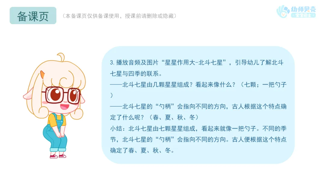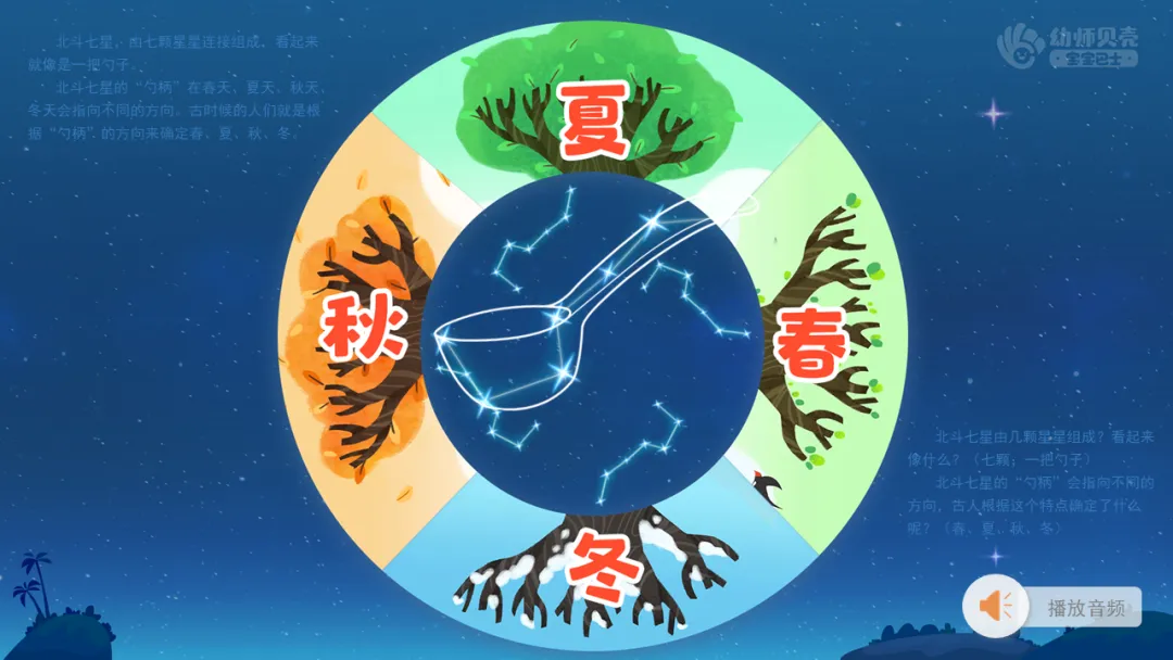 3.播放音频及图片“星星作用大-北斗七星”,引导幼儿了解北斗七星与四季的联系。