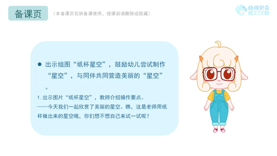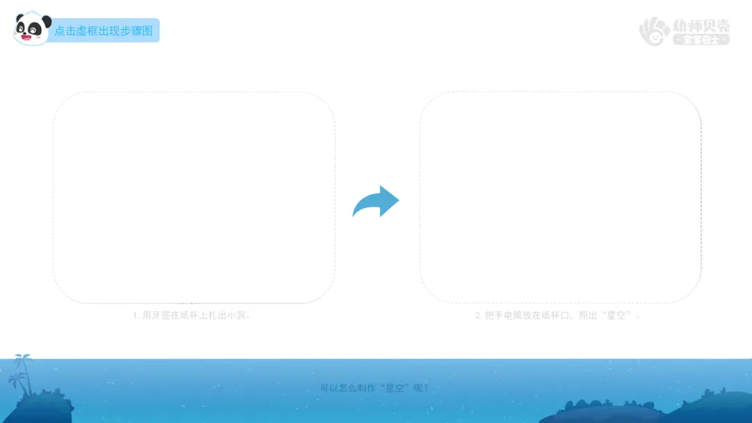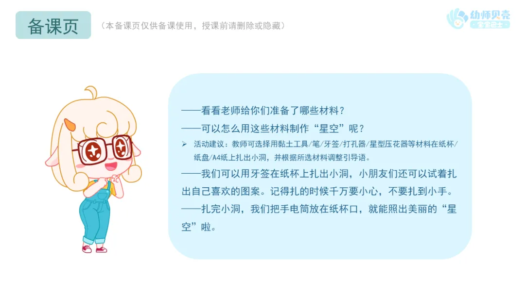 Ø活动建议:教师可选择用黏土工具/笔/牙签/打孔器/星型压花器等材料在纸杯/纸盘/A4纸上扎出小洞,并根据所选材料调