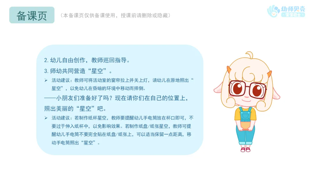 Ø活动建议:教师可将活动室的窗帘拉上并关上灯,请幼儿在原地照出“星空”,以免幼儿在昏暗的环境中移动而摔倒。