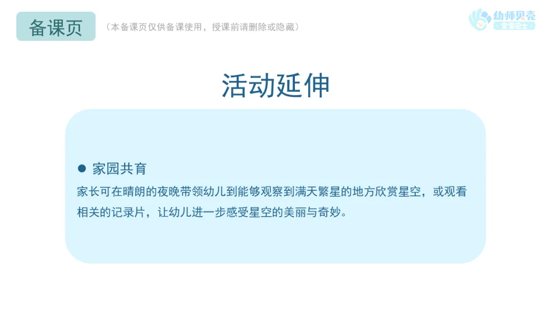 家长可在晴朗的夜晚带领幼儿到能够观察到满天繁星的地方欣赏星空,或观看相关的记录片,让幼儿进一步感受星空的美丽与奇妙。