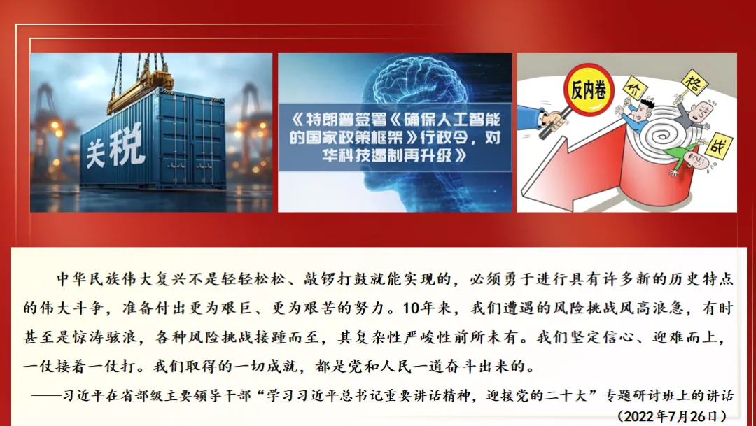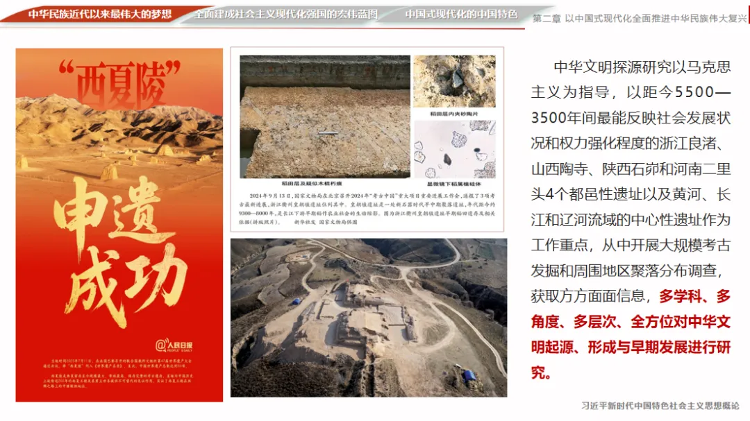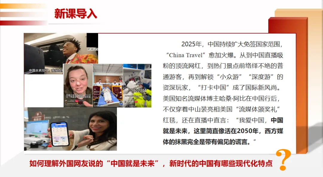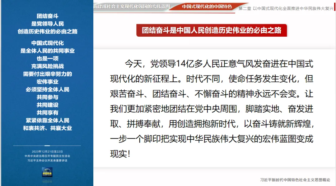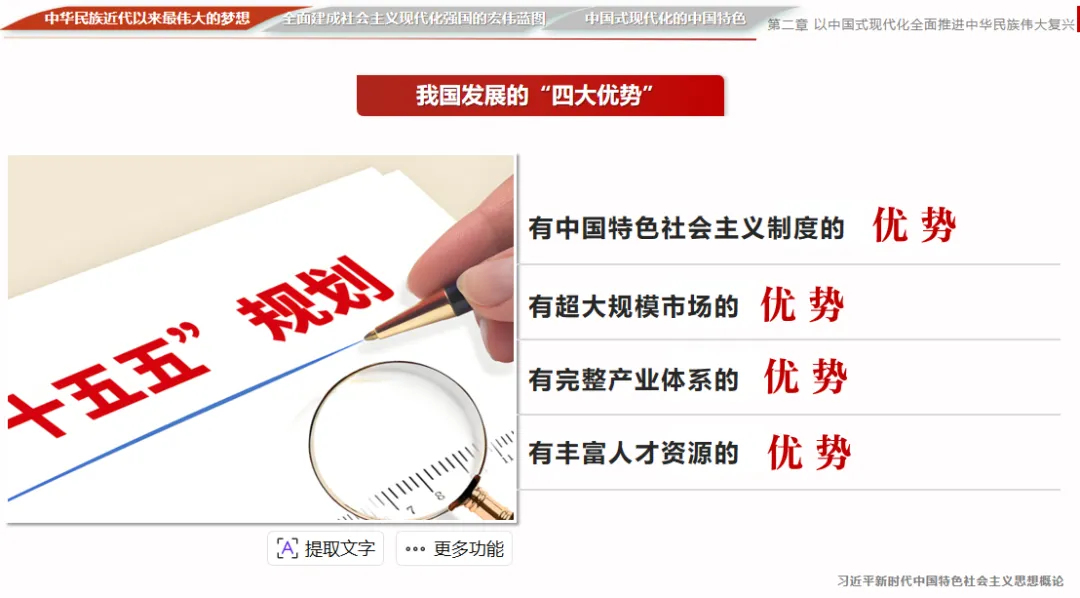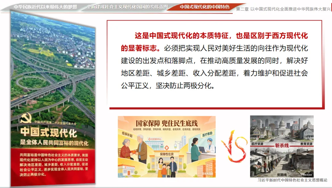 【P22】(三)中华民族伟大复兴展现出前所未有的光明前景和严峻挑战 作为中华民族团结奋斗的最大公约数和最大同心圆,中国梦凝聚了中国人民和中华民族的价值认同和价值追求。不管是身处国内的同胞,还是海外华人华侨,都在为这个梦想而努力。【P23】回顾党的百年历程,我们能清晰地看到中华民族伟大复兴的一步步推进:1921—1949 年,实现了中国从几千年封建专制政治向人民民主的伟大飞跃,中国人民从此站起来了;1949—1978 年,实现了一穷二白、人口众多的东方大国大步迈进社会主义社会的伟大飞跃;1978—2012 年,推进了中华民族从站起来到富起来的伟大飞跃,中国大踏步赶上了时代;2012 年至今,中华民族迎来了从站起来、富起来到强起来的伟大飞跃。这四次伟大飞跃,一次比一次振奋人心,充分证明了实现中华民族伟大复兴进入了不可逆转的历史进程。【P24】在实现民族复兴的道路上,我们拥有独特的 “四大优势”,这是我们前进的底气所在。第一,有超大规模市场的优势,14 亿多人口的市场需求,为经济发展提供了广阔空间;第二,有中国特色社会主义制度的优势,我们的制度能够集中力量办大事,应对各种风险挑战;第三,有完整产业体系的优势,从基础工业到高端制造,我们形成了门类齐全的产业体系,保障了经济的稳定发展;第四,有丰富人才资源的优势,越来越多的高素质人才投身到国家建设中,为创新发展提供了智力支撑。【P57】第二个中国特色,全体人民共同富裕的现代化。这是中国式现代化最鲜明的底色,也是最根本的追求。西方很多国家的现代化,往往伴随着严重的贫富分化,富人更富、穷人更穷。我们不一样,我们从一开始就把“共同富裕”写在自己的旗帜上。什么是共同富裕?不是同时富裕,也不是平均主义,而是让每个人都能享受到发展的成果,逐步缩小城乡、区域、收入差距,让公平正义的阳光照进现实。这体现的是一种“以人民为中心”的发展哲学。【P58】我给大家讲一个很温暖的小例子,发生在深圳。深圳不仅是创新之城,也是“温暖之城”。福田区有“食物银行”,里面存放的不是钱,是面包、水果、蔬菜,免费提供给有需要的人。龙华区一个社区党群服务中心,设有24小时图书馆,不仅方便市民学习,还设置“暖心柜”,放上面包、泡面,免费领取。这些细节说明什么?说明现代化不是冷冰冰的GDP数字,而是有温度的生活体验,是对每一个个体的关怀。这就是中国式现代化该有的样子。......