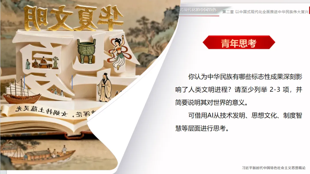 【P10】同学们,这个梦想不是凭空产生的,而是源于中华民族悠久的文明传承。中华民族有着五千多年的文明史,这份深厚的文明底蕴,是我们追求复兴的底气所在。说到这里,我想请大家思考一个问题:在漫长的历史长河中,中华民族有哪些标志性成果深刻地影响了人类文明的进程呢?大家可以开动脑筋,从技术发明、思想文化、制度智慧等多个层面来想想。是四大发明?是儒家的“和合”思想?还是科举制度所体现的公平理念?无论你的答案是什么,这些都证明了中华文明对世界的巨大贡献。