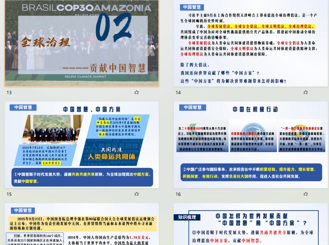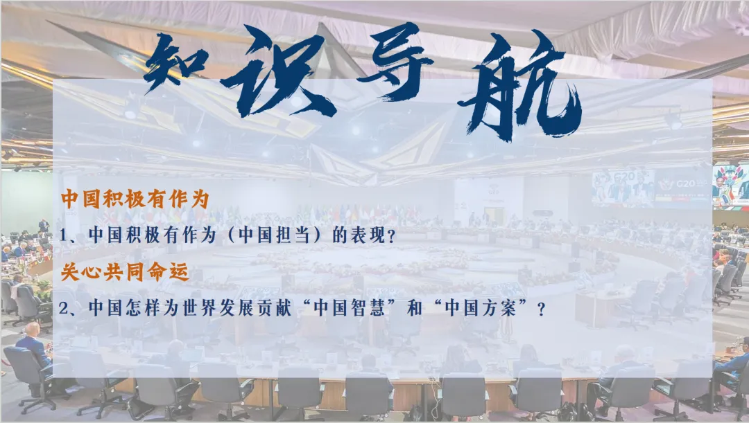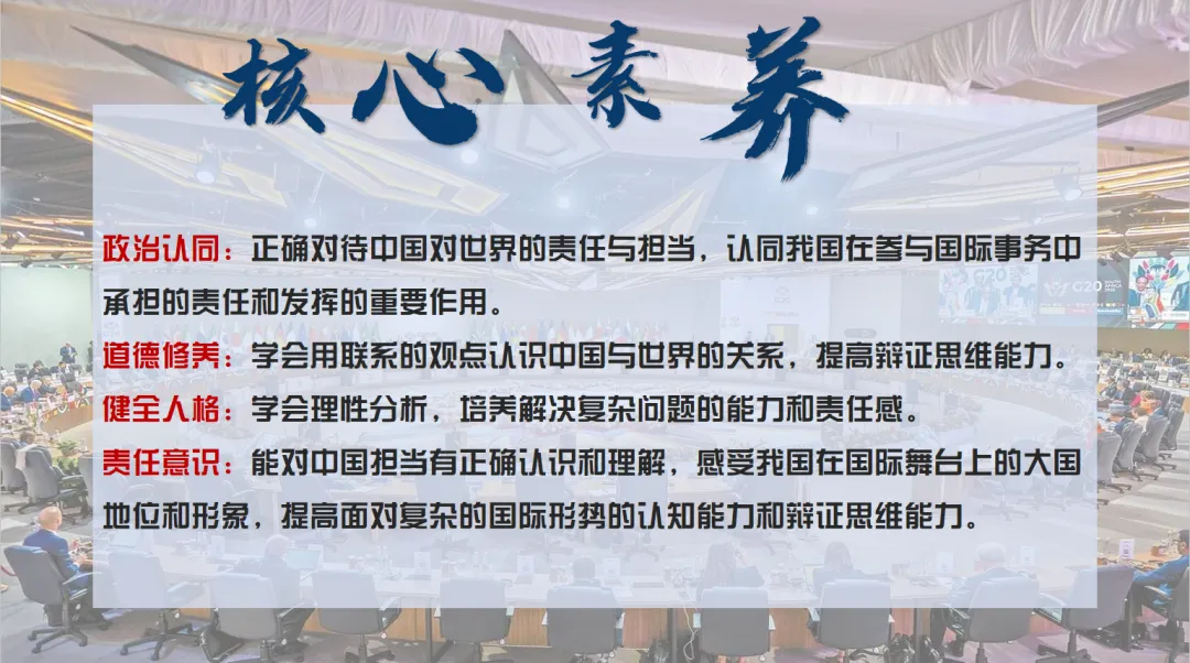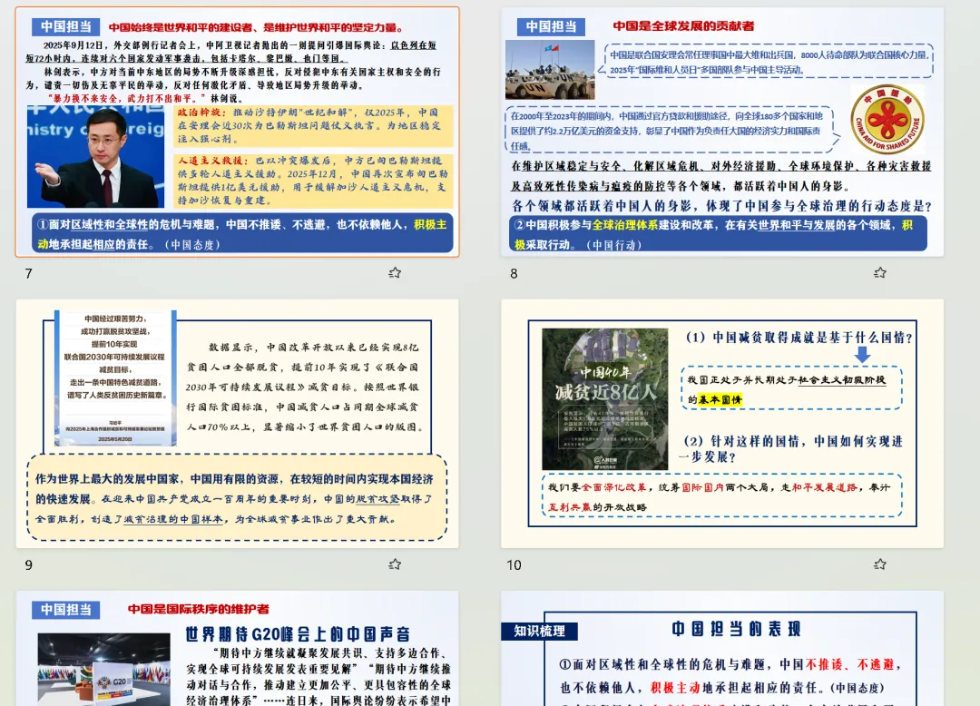 课件围绕“世界舞台上的中国”这一总议题展开,构建“态度—行动—贡献—智慧—理性看待”的清晰知识脉络,打破抽象概念的壁垒,将“中国担当”具象化、生活化。整体内容贴合教材重难点,重点解读中国积极有作为的具体表现、中国为全球治理贡献的智慧与方案,同时衔接中考考点,为学生后续备考奠定基础。