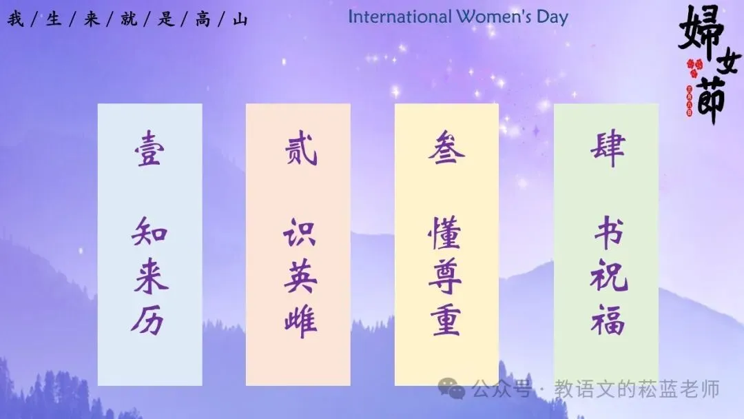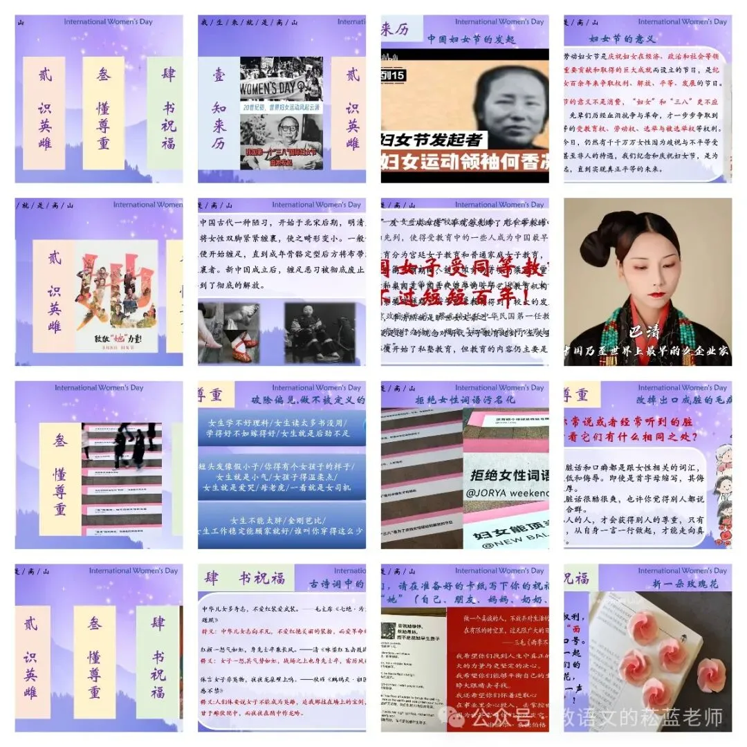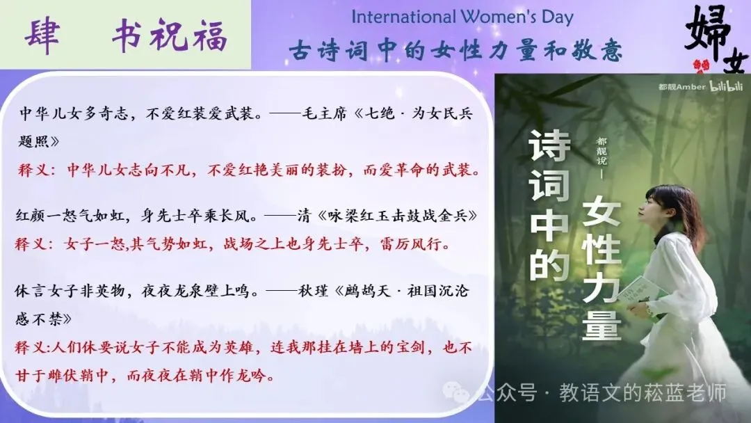 1、展示描写女性力量、致敬女性的诗句,播放视频《诗词中的女性力量》