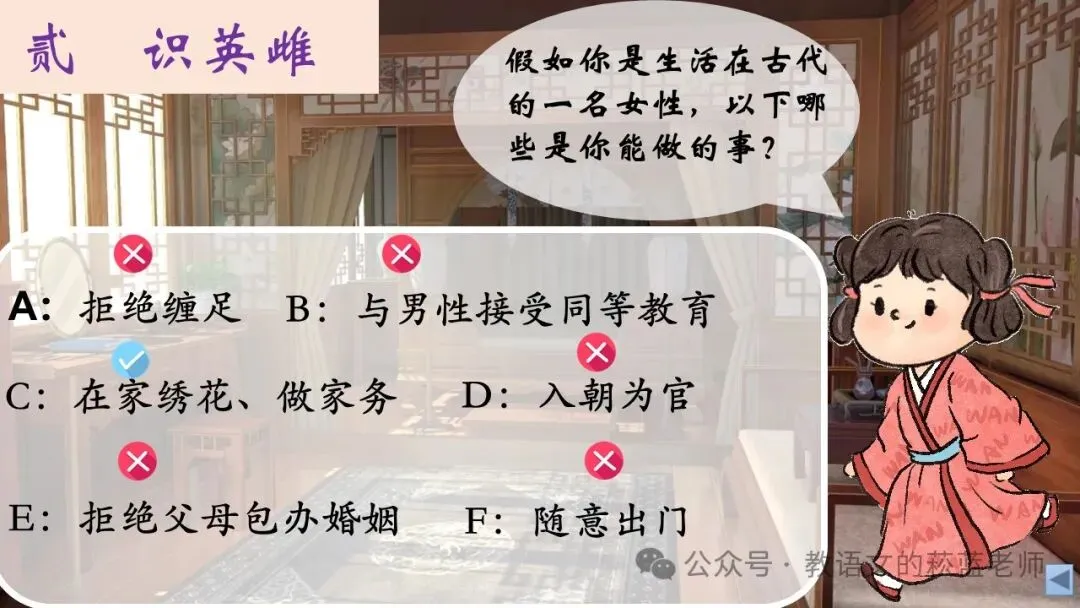 1、同学们,倘若你是生活在古代的一个平民女性,以下哪些事情是你能做的呢?(出示选择题,学生答题)
