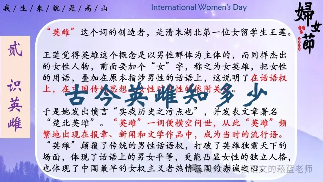 6、播放视频《古今英雌》,认识伟大女性。