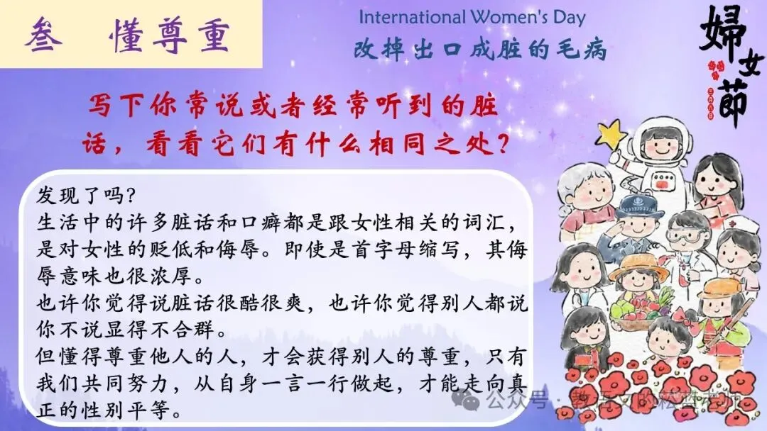 这个部分融合了以前上过的打破性别偏见和脏话班会的内容,现在网络过于发达,进入青春期的孩子满嘴脏话的情况很普遍,适当引导很重要。
