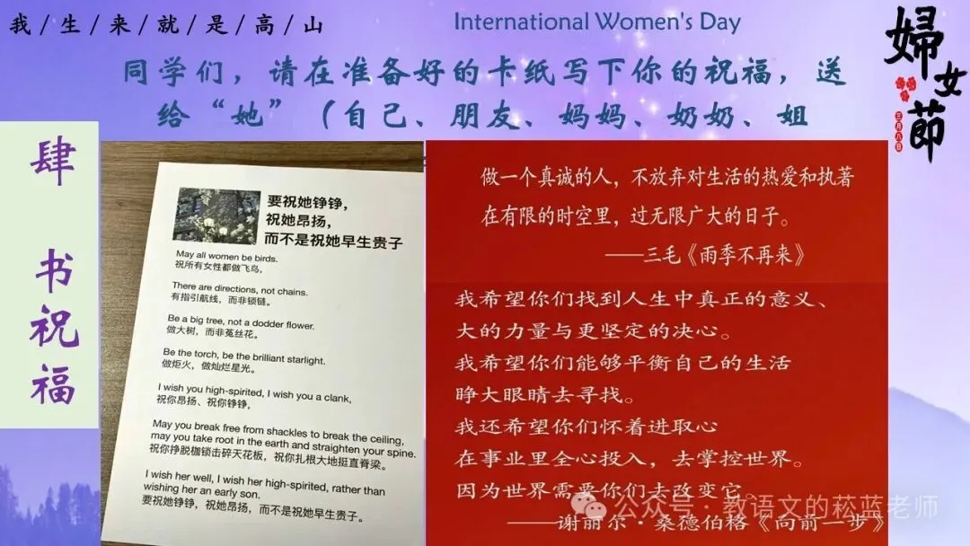 2、让学生在准备好的正方形卡纸上写下对“她”的祝福,这个“她”可以是自己,也可以是女性朋友、家人、长辈。