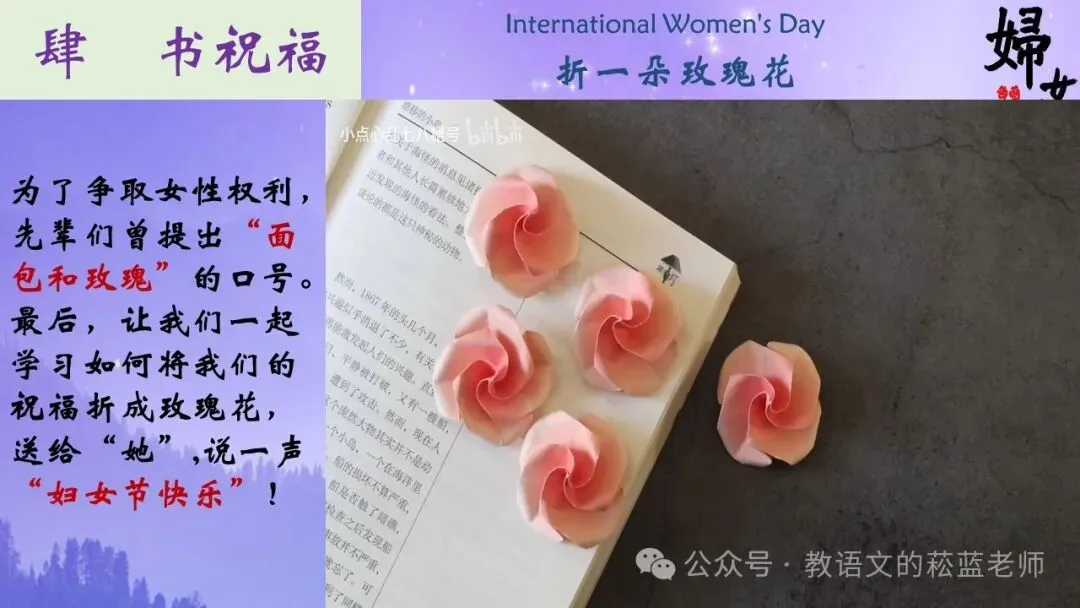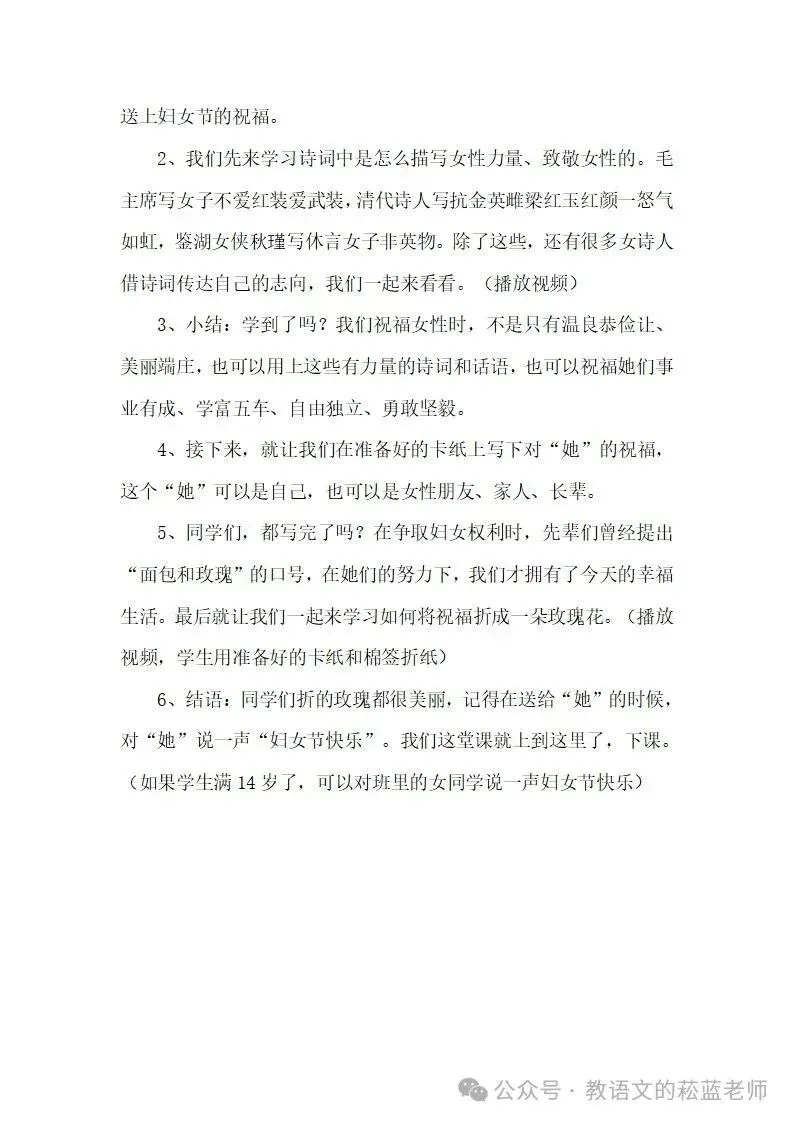 4、结语:同学们折的玫瑰都很美丽,记得在送给“她”的时候,对“她”说一声“妇女节快乐”。我们这堂课就上到这里了,下课。(如果学生满14岁了,可以对班里的女同学说一声妇女节快乐)