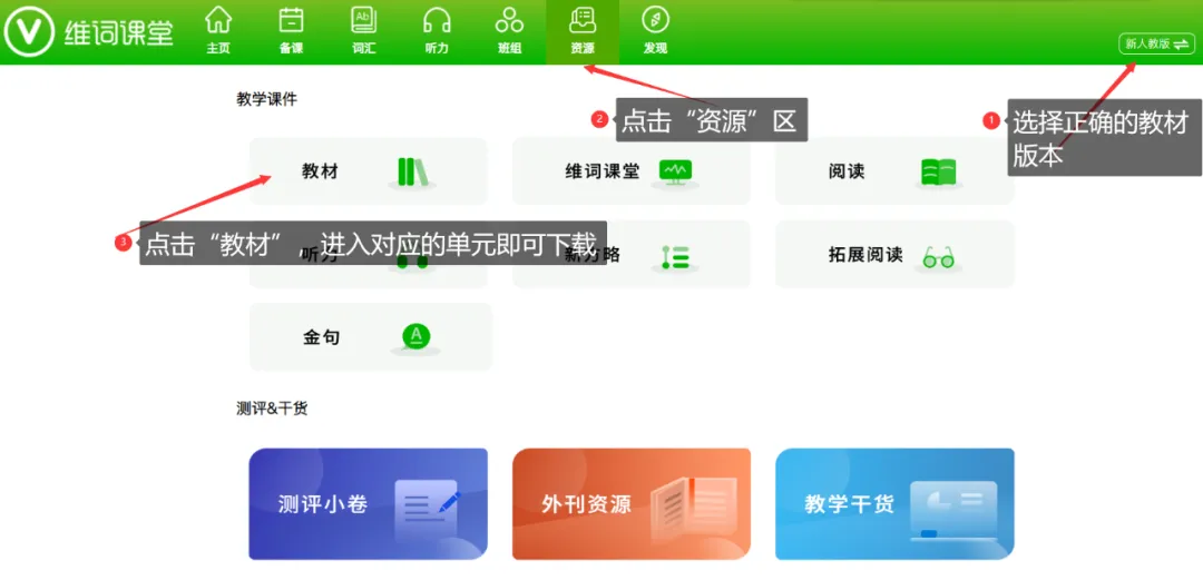 为了帮教师减负增效,维词PC端同步四大版本新教材,分版块、按课时,给教师准备了新教材讲解课件,作为新教材讲解的参考,让教师的新教材课堂教学游刃有余。