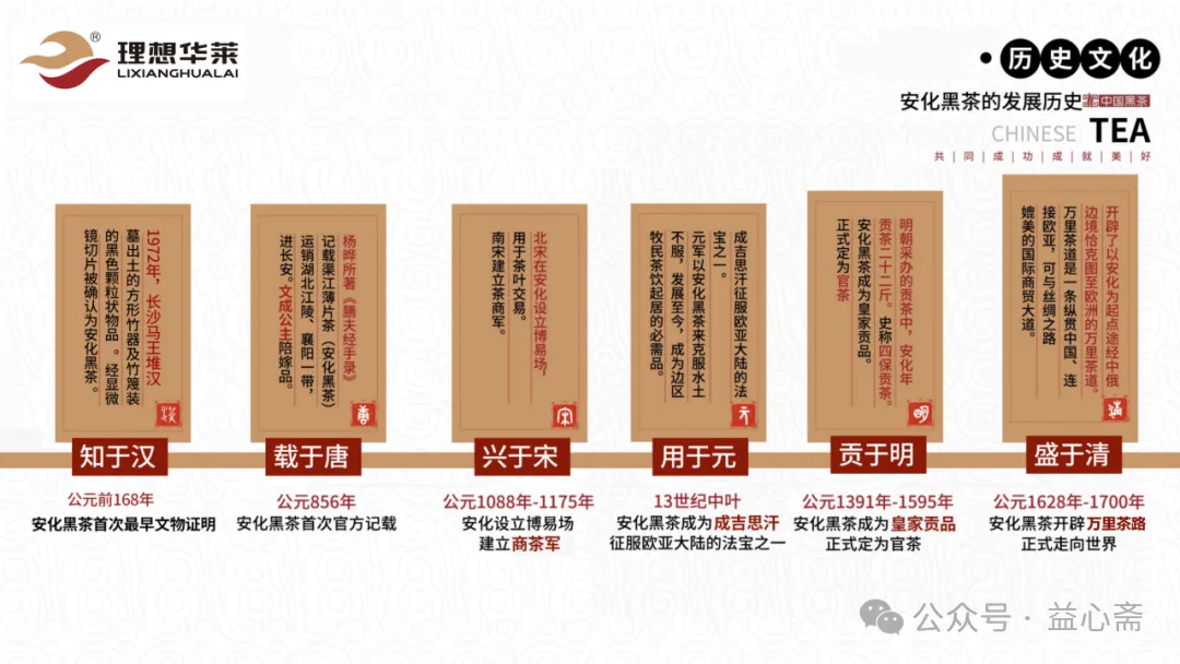 安化黑茶历史 :起源于汉朝,发展于唐朝,兴于宋朝,用于元朝,贡于明朝,胜于清朝。成吉思汗在欧亚大陆扩张时,依靠安化黑茶解决士兵水土不服问题。我们的这款产品,始于唐朝兴于宋,那么在最早的时候呢,在我们用于大家听到一段佳话叫成吉思汗统战欧亚大陆,创版图之最的时候,那么他带的其中六大法宝之一是我们的安化黑茶,因为可以解士兵的水土不服,而当那个年代的时候,你用银子是买不到汗血宝马的,只有用我们的茶叶去兑换。明朝的时候呢,我们的安化黑茶又成为了贡茶,皇家贡茶正式地定为了官茶,那当清朝的时候,我们的安化黑茶又开辟了万里茶道,我们经常是不是听到一句话叫王子犯法,与庶民同罪,那这段佳话从何而来呢?就是当时朱元璋的女婿,因为当时在那个年代,官场规定官茶不可以贩卖,只要贩卖到1万斤,那么你是犯法的,而当时的朱元璋女婿贩卖了10万斤的安化黑茶,那当朱元璋在选择女婿和法律之前,他选择砍了自己女婿的头,所以有了这么一段佳话,叫王子犯法与宿民同罪。