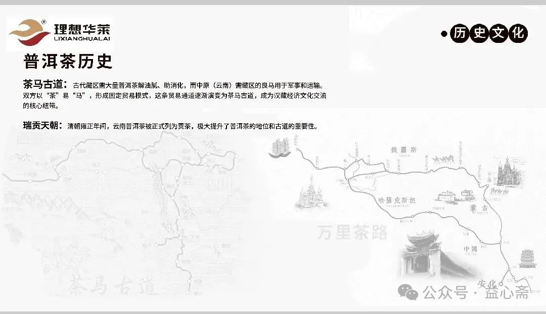 普洱茶历史 :清朝雍正年间被列为贡茶,通过茶马古道传播。普洱茶名声较大,但因收藏炒作而偏离直销路线。