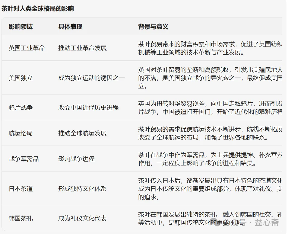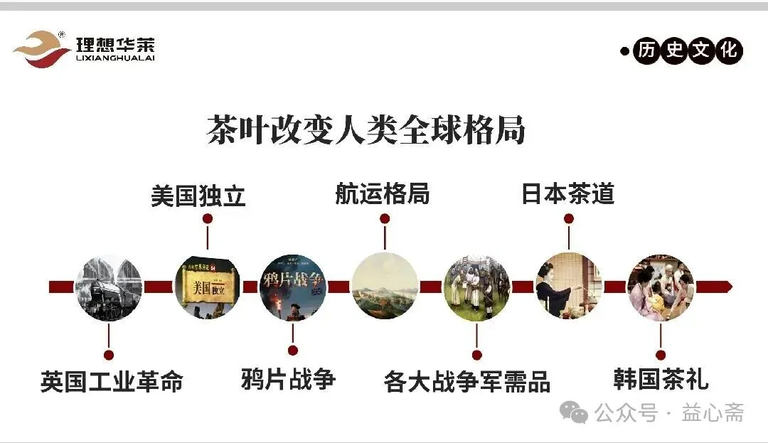 全球影响 :茶改变全球格局,如英国工业革命、美国独立、鸦片战争等事件中,中国黑茶发挥关键作用。例如,鸦片战争源于茶叶贸易失衡。 丝绸之路(汉代)、海上丝绸之路和万里茶路(清代)将茶传播到欧美,郑和下西洋首次将中国茶带出国门。