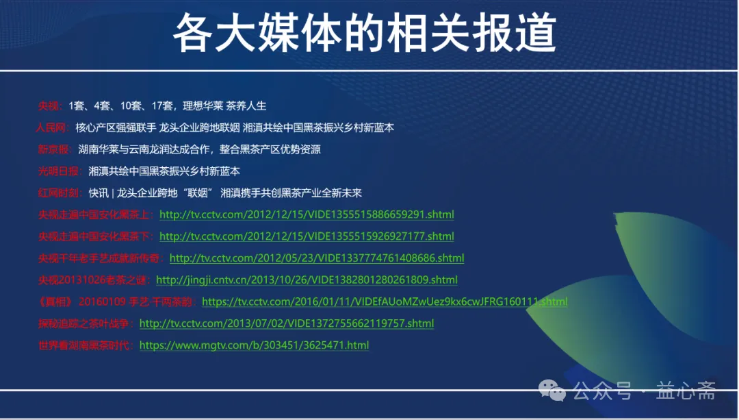 央视一套、四套、十七套报道“理想华莱茶养人生”;人民日报、人民网、光明日报、央视走遍中国等平台发布六个必看视频,覆盖茶历史和公司背景。例如,2012年央视二台财经报道50分钟专题,对比公司发展。