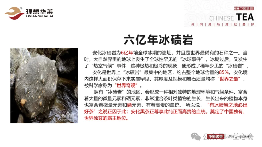 源于6亿年前的冰碛岩,那6亿年前的冰碛岩是一个极冷极热,自然罕见的一个现象形成的一款石头,而这款石头呢,经过了6亿年的这种土壤风化,它上面长出来的茶叶是全世界茶叶平均值的7倍,它的微量元素高达480多种,那么这种冰碛岩它有一个名字,俗称叫“长寿食”,“吉祥石”。已成为安化奇石,视为珍宝拥有不可估量的价值。 在整个全球,85%是在安化经历的,还有15%在南非,所以我们经常喝的一款咖啡豆南山咖啡星巴克也是非常独一无二的。