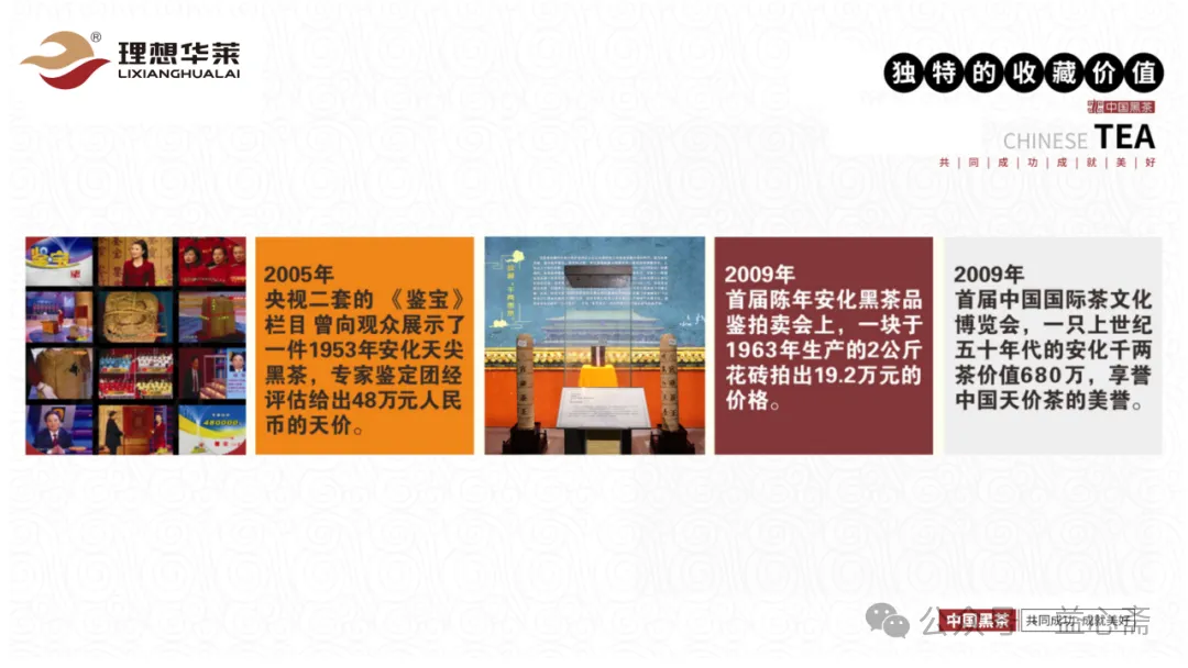 其中有一个鉴宝栏目,中央二台的鉴宝栏目,1953年的天尖拍到了48万的价格,那么在2021年的黑茶文化节上,1958年的3公斤的茯砖茶拍到了110万的价格,在09年的茶叶博览会上,一款上世纪的千两茶拍到了680万的价格,所以享誉了天价茶的美誉。安化黑茶也有了一个能喝的古董,也叫软黄金、白金、铂金,不如我们的黑金,那黑金就是我们茶里面的金花。
