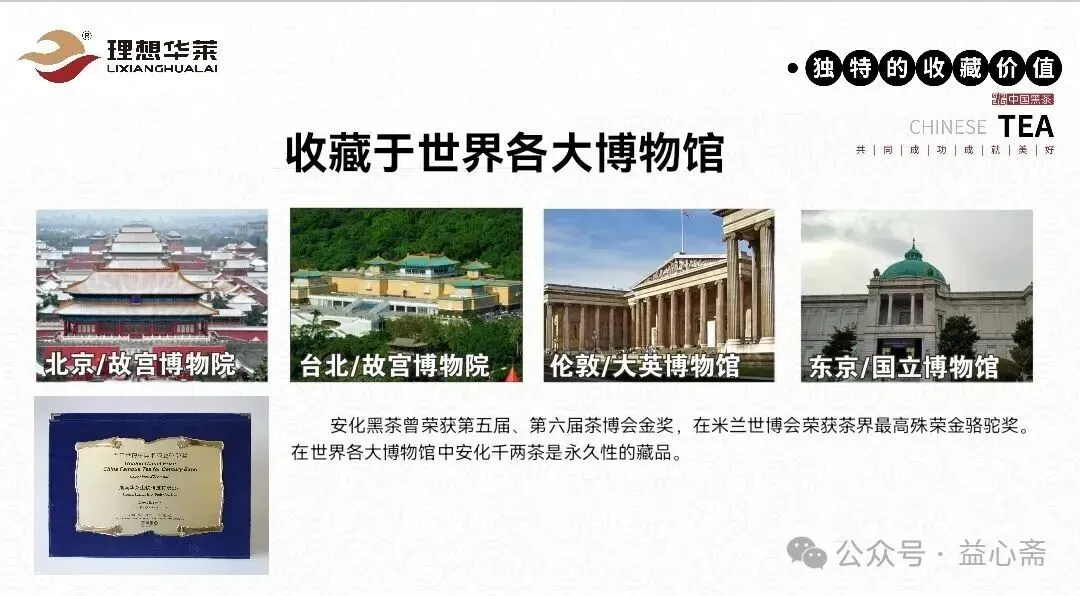 安化黑茶不但有中国黑茶博物馆,而且我们收藏于世界四大博物馆里面,比如说北京的故宫博物院,台北的故宫博物院,伦敦的大英博物馆,以及东京的国立博物馆都有收藏安化黑茶,因为安化黑茶每年有15%-25%的一个倍增。