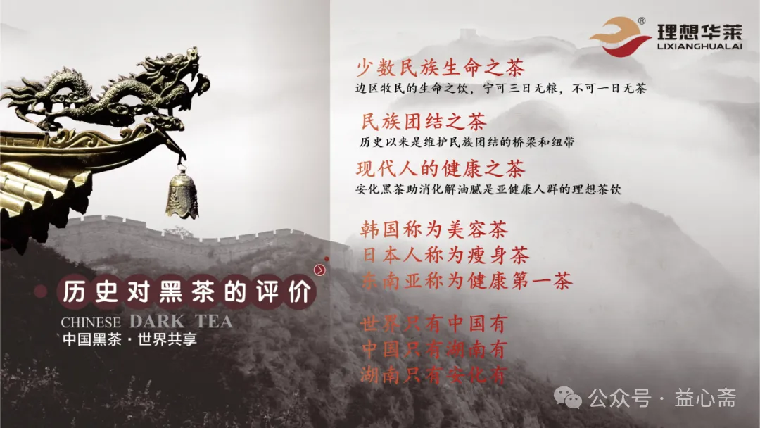 再说说咱们的安化黑茶,它已有 2300 年历史,可不是先有公司才有产品,而是先有这珍贵的安化黑茶,才有了我们的企业。而且,安化黑茶是 21 世纪的健康之饮,能与可可、咖啡并驾齐驱。至于为何号召全民饮用,要知道,我们的茶在最早的时候,就有着同药食用,到现在的饮用,我们经常听到是不是这个开门七件事,柴米油盐酱醋茶。