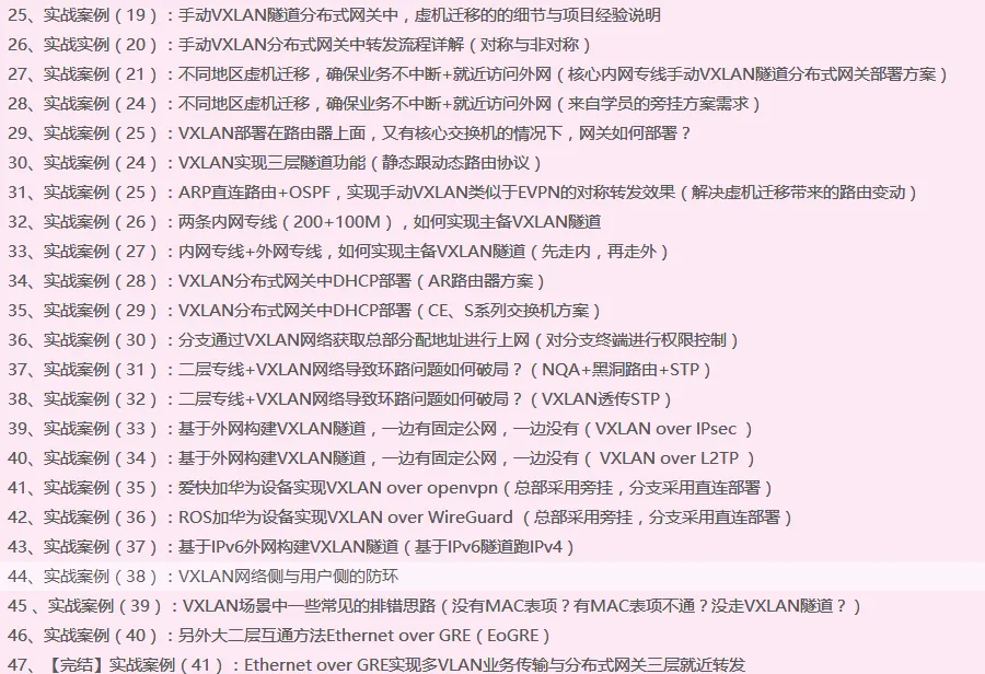 总共47篇的内容,41个实战案例,针对企业网常见的VXLAN需求进行讲解(全部手动VXLAN隧道,不涉及EVPN),包括