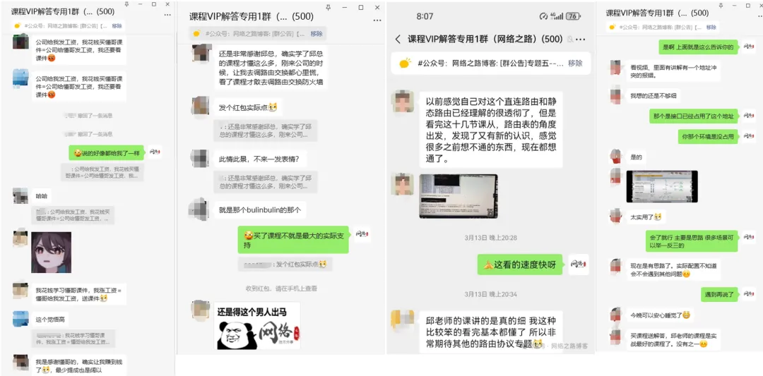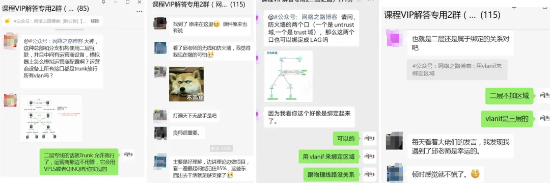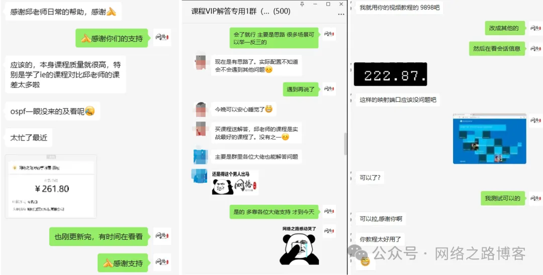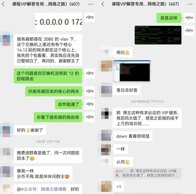 博主的课程特点就是理论加实战融为一体,细节地方讲到位,并不是像官方一样的课程流程,而是根据自己经验独立原创写的,很多细节没有讲解到,而博主的课喜欢把一个知识点或者技术讲解的透彻,从原理、应用、排错到实战都涉及,这样形成了官方可能一个PPT一节课讲完了,到我这边就要2~5篇的内容,这就是课程的核心,除了让你掌握原理配置以外、还能掌握如何去排错、运用到实际中去,这个是官方课程或者培训不具备的,这也是解决实际工作问题必须掌握的内容。很多朋友会觉得课程价格偏贵,但是这个课程质量绝对对得起这个价格,很多学员都会调侃说,如果遇到一种一个案例,课程钱就回来了,这个确实是事实。(另外平时大家问问题,很多都没有回复解答,这个主要是精力都放在VIP群里面了,有时候没看到下面的信息,或者忙不过来解答,这也是其他普通群没啥气氛的原因,这个只能说声抱歉哈)