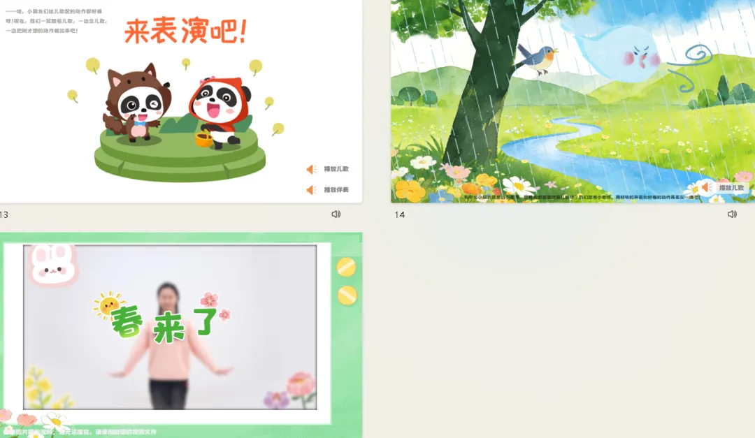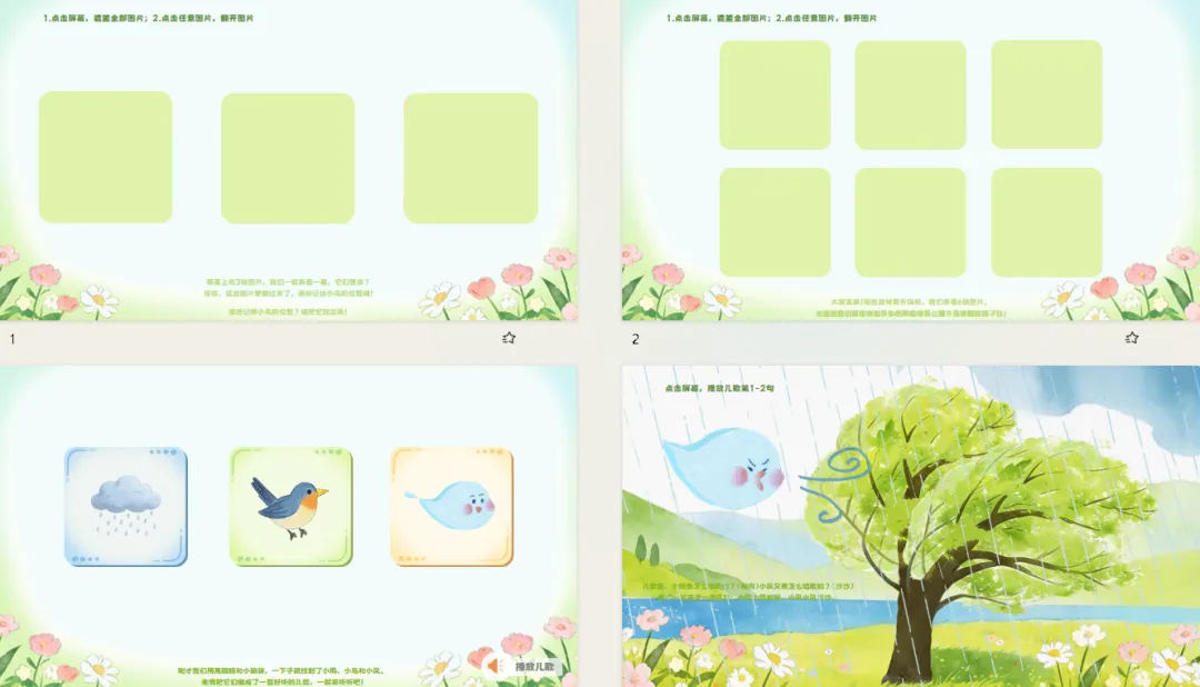 ——刚才我们用亮眼睛和小脑袋,一下子就找到了小雨、小鸟和小风。老师把它们编成了一首好听的儿歌,一起来听听吧!