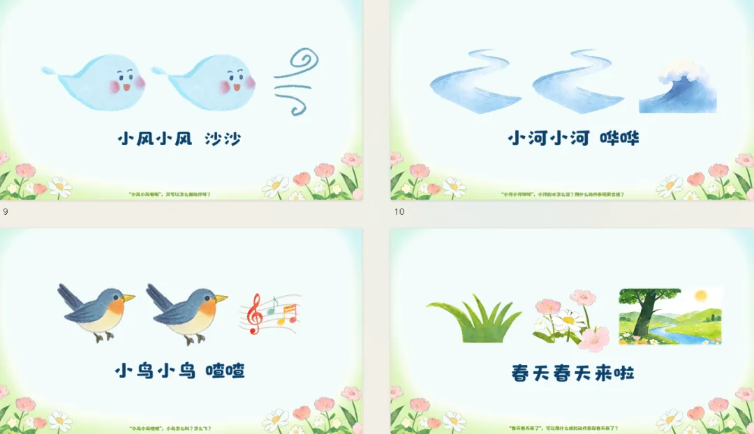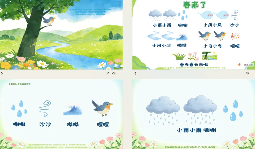 l 重点:理解儿歌内容,知道春天的声音的景象。