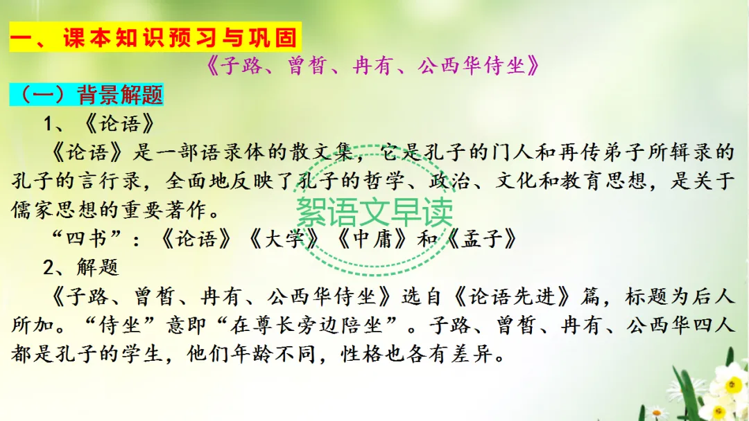 《子路、曾皙、冉有、公西华侍坐》选自《论语先进》篇,标题为后人所加。“侍坐”意即“在尊长旁边陪坐”。子路、曾皙、冉有、公西华四人都是孔子的学生,他们年龄不同,性格也各有差异。
