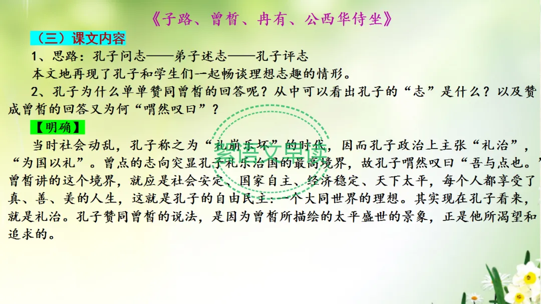 2、孔子为什么单单赞同曾皙的回答呢?从中可以看出孔子的“志”是什么?以及赞成曾皙的回答又为何“喟然叹曰”?