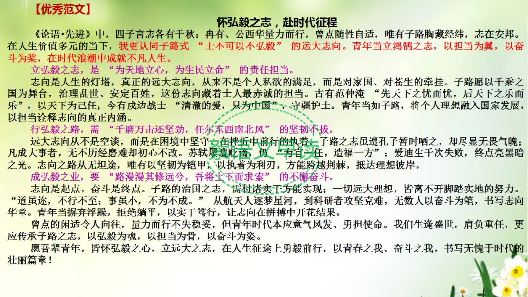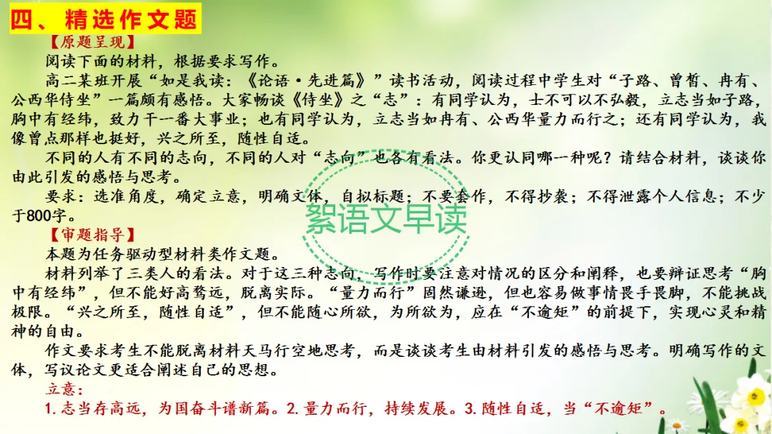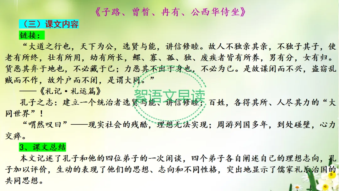 本文记述了孔子和他的四位弟子的一次闲谈,四个弟子各自阐述自己的理想志向,孔子加以评价,生动的表现了他们的思想、志向和不同性格,突出地显示了儒家礼乐治国的共同思想。