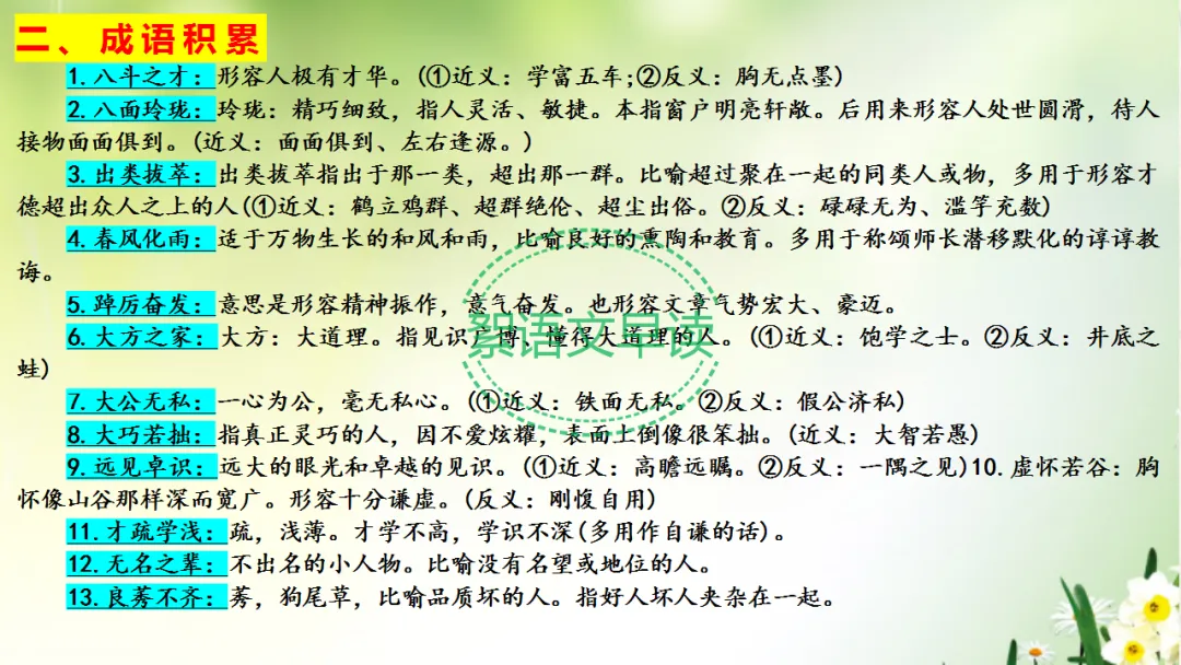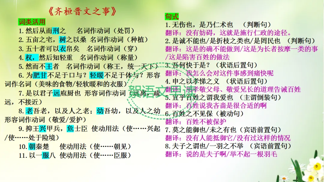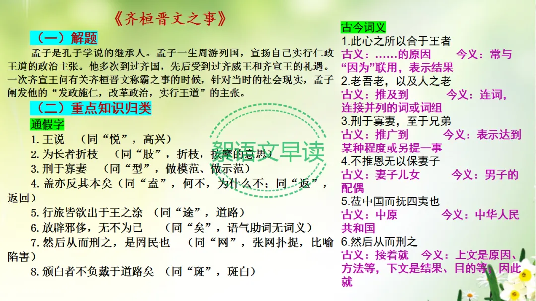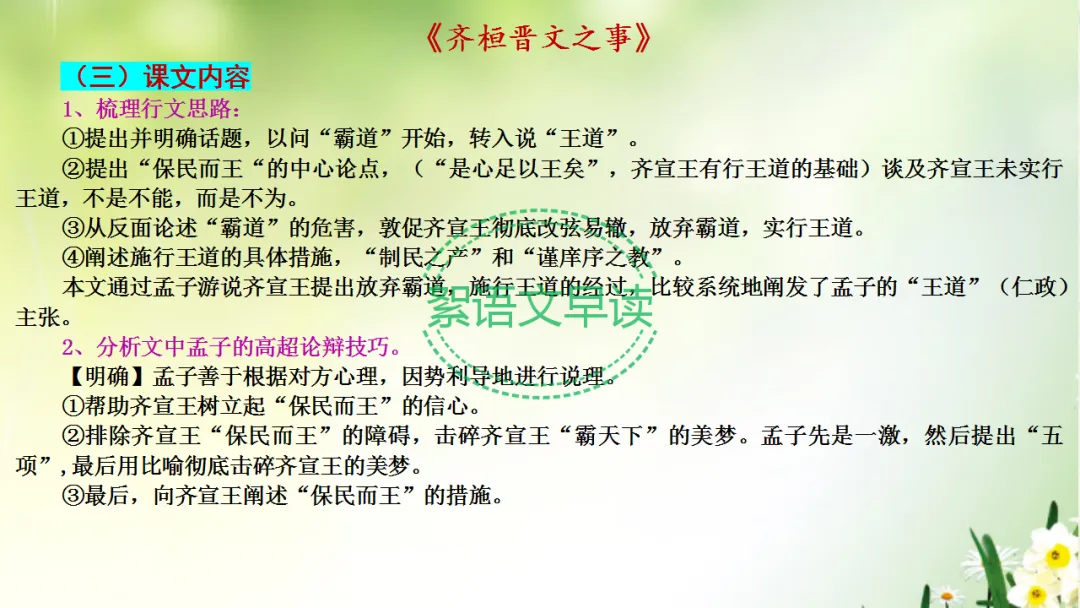 ②排除齐宣王“保民而王”的障碍,击碎齐宣王“霸天下”的美梦。孟子先是一激,然后提出“五项”,最后用比喻彻底击碎齐宣王的美梦。