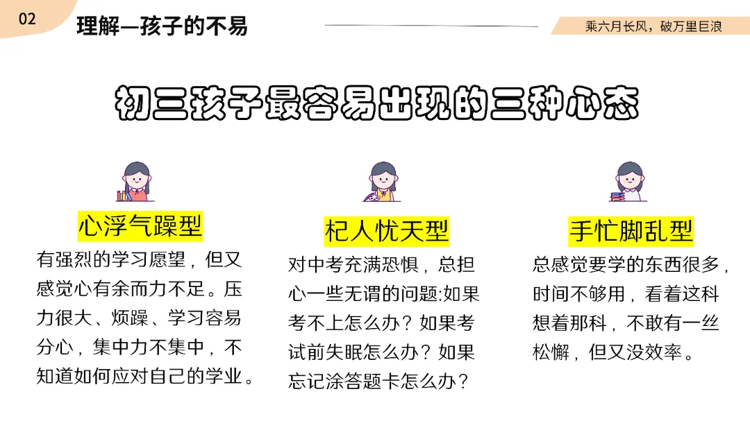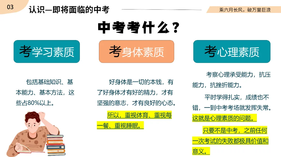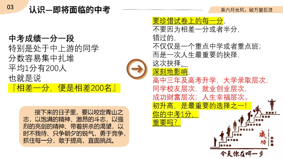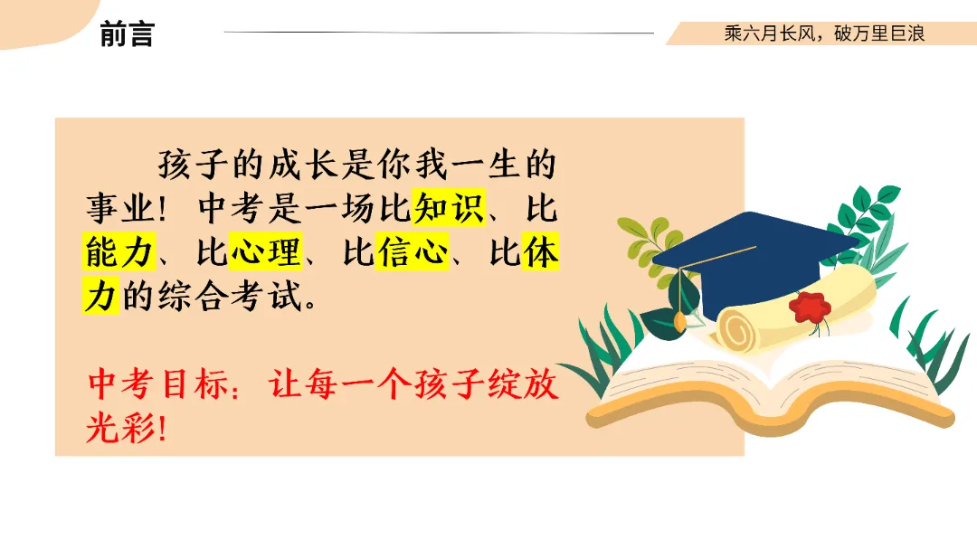 初三下学期考前冲刺主题班会课件PPT:“同心共赴,中考加油!”(课件+发言稿,电子版可编辑),部分内容由PPT展示可见。