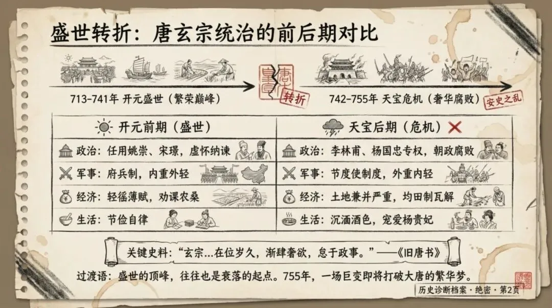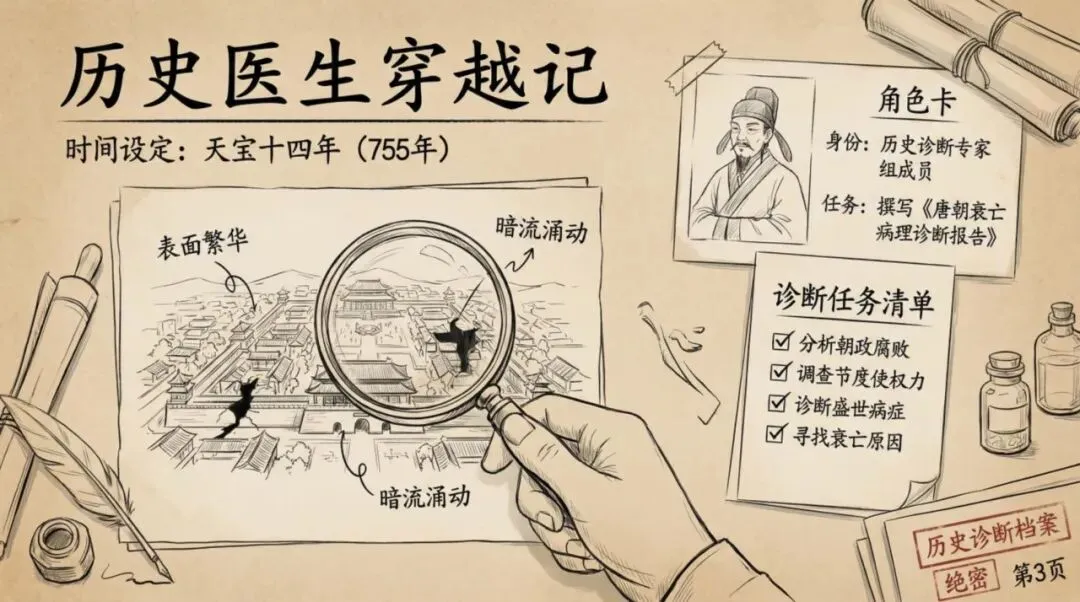 天宝十四年(755年),你是一位来自未来的历史医生,穿越回到盛唐末期。眼前是曾经辉煌的长安城,但表面繁华下暗流涌动。皇帝沉湎享乐,朝政日渐腐败;边镇节度使安禄山手握重兵,野心勃勃。盛世即将崩塌,你的任务是"诊断"这个庞大帝国的病症:为什么会爆发安史之乱?叛乱带来了哪些破坏性后果?唐朝最终走向灭亡的深层原因是什么?你将带领团队,通过查阅史料、分析案例、撰写报告,为这场历史剧变给出专业的"病理诊断"。