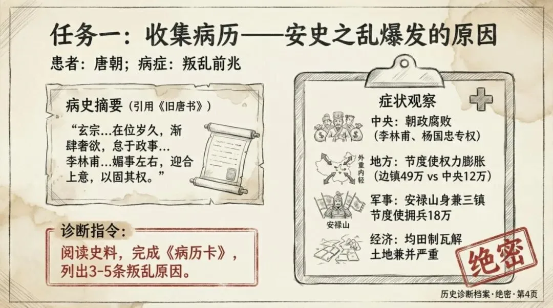 作为历史诊断团队,你们需要首先"收集病历",了解这位"患者"(唐朝)的病情。阅读教材和史料,分析安史之乱爆发前的各种"症状",找出导致叛乱的原因。