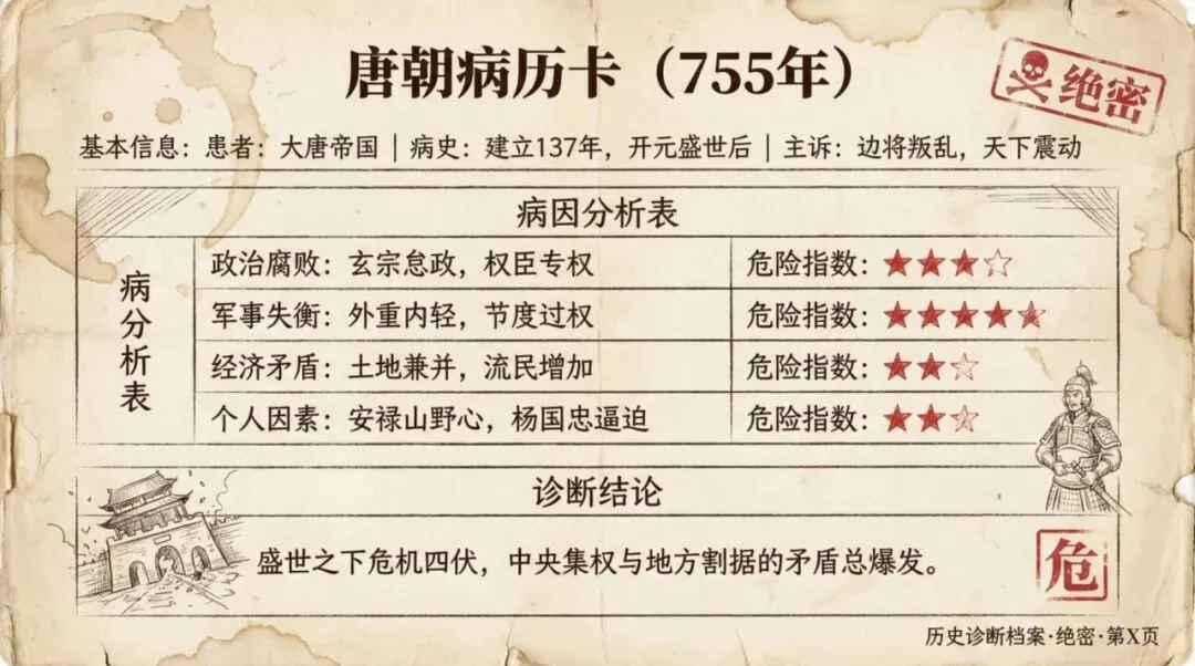 通过收集病历、追踪病程、分析并发症,最终撰写一份完整的"历史诊断报告",总结唐朝衰亡的原因和教训。