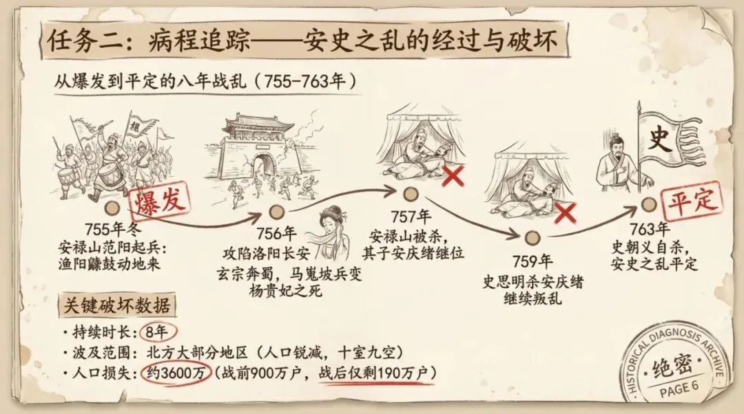 了解病情后,现在需要"追踪病程"。按照时间顺序,梳理安史之乱的爆发、发展和平定过程,特别关注这场叛乱对唐朝社会造成的严重破坏。