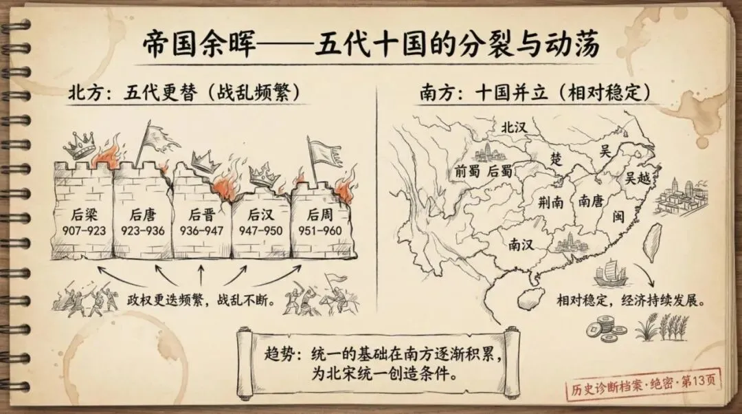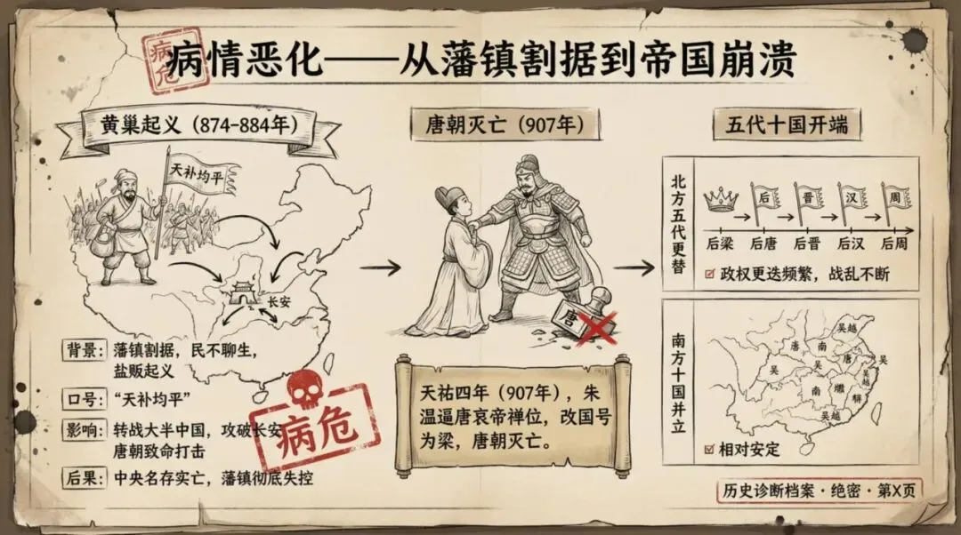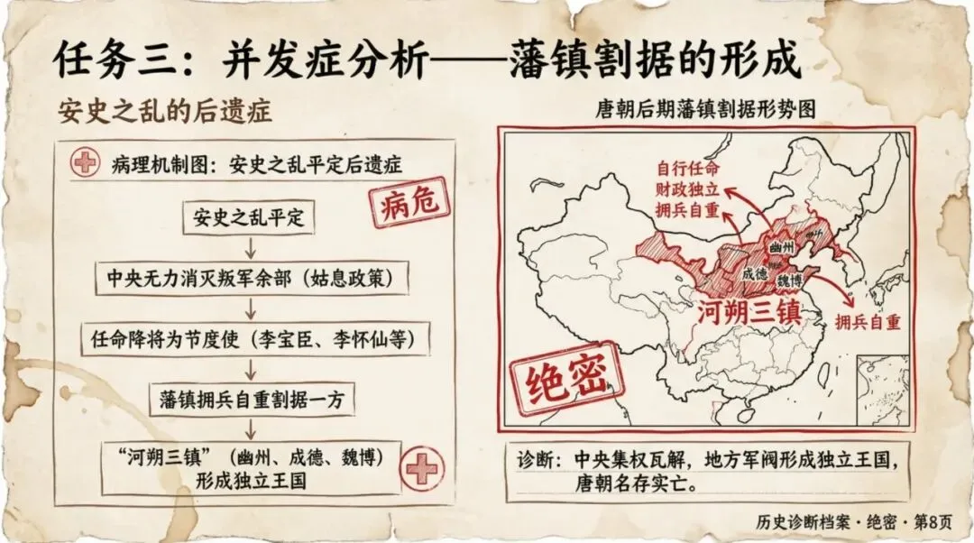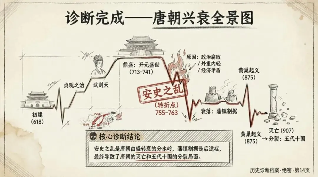 - 撰写"历史诊断报告",包括:病情描述(安史之乱的背景和影响)、并发症分析(藩镇割据)、最终结果(唐朝灭亡与五代十国)、历史教训(对后世的启示)