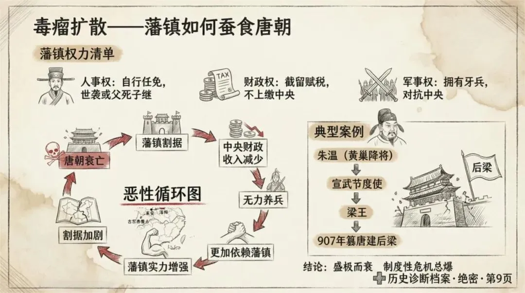 安史之乱虽然被平定,但留下了严重的"并发症"——藩镇割据。分析藩镇割据的形成原因和具体表现,理解它如何成为唐朝灭亡的加速器。