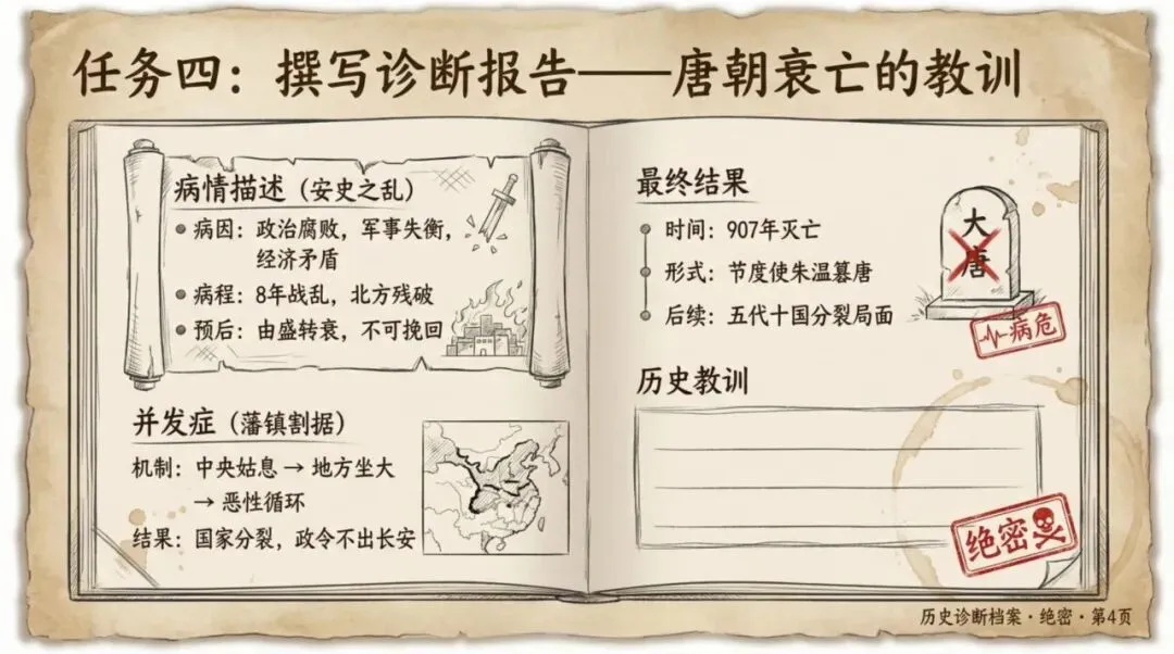 - 任务描述:作为历史诊断团队,你们已经完成了对唐朝"病情"的全面分析。现在,请撰写一份"历史诊断报告",总结唐朝由盛转衰、最终灭亡的原因,并提炼出对后世的警示。