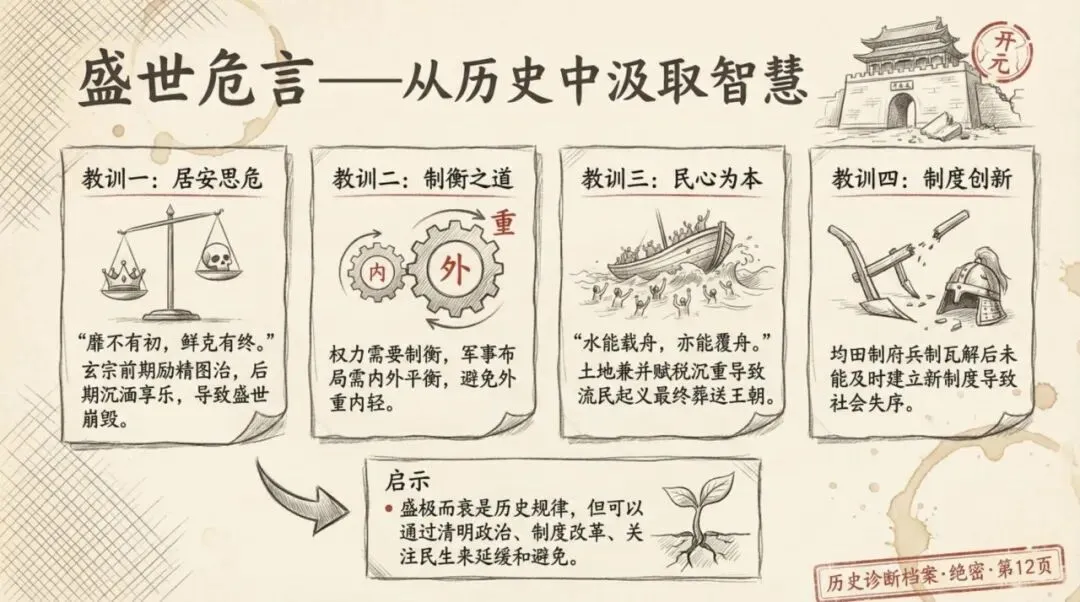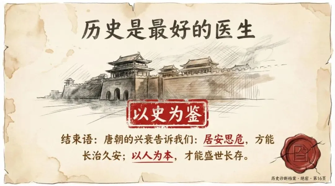 作为历史诊断团队,你们已经完成了对唐朝"病情"的全面分析。现在,请撰写一份"历史诊断报告",总结唐朝由盛转衰、最终灭亡的原因,并提炼出对后世的警示。