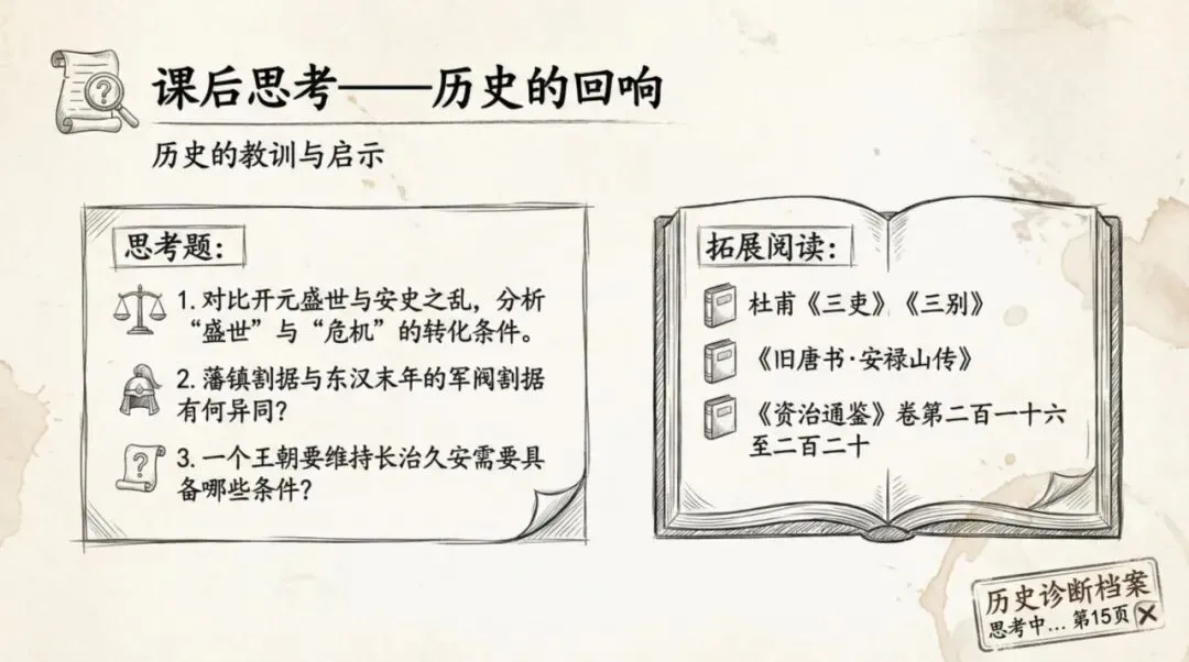 - 引导思考:从唐朝由盛转衰的历史中,我们可以得到哪些对今天有用的启示?(如:居安思危、清明政治、民心向背等)