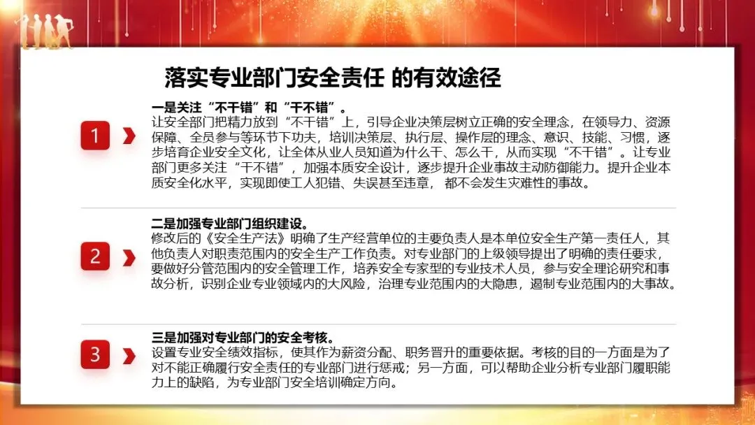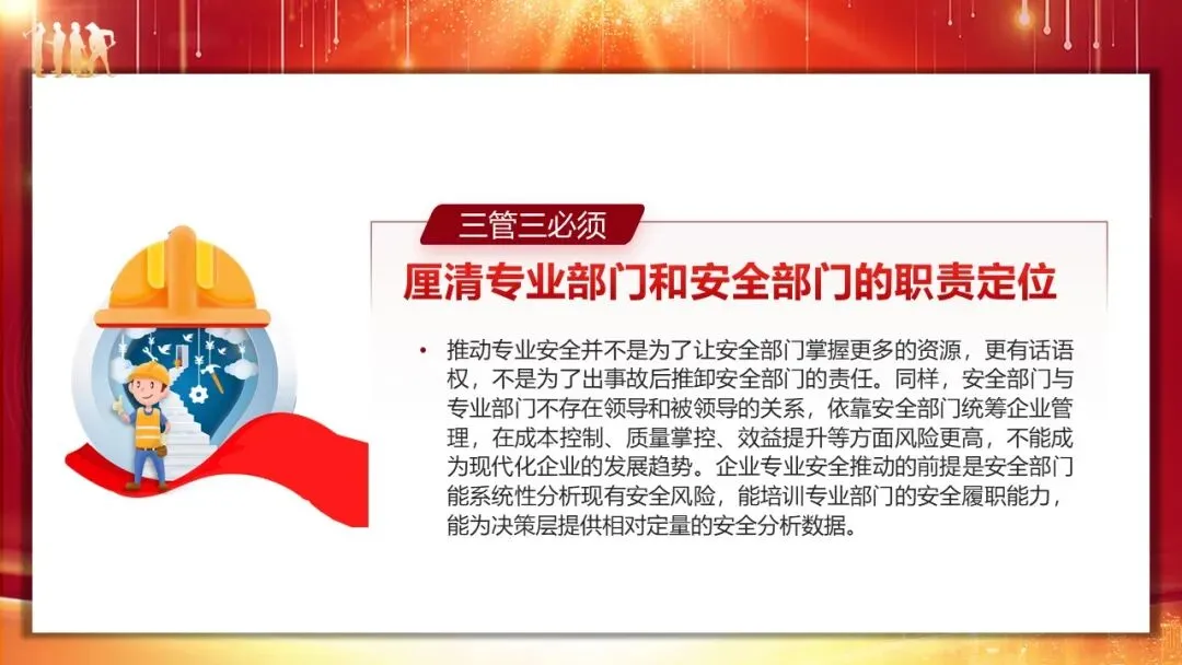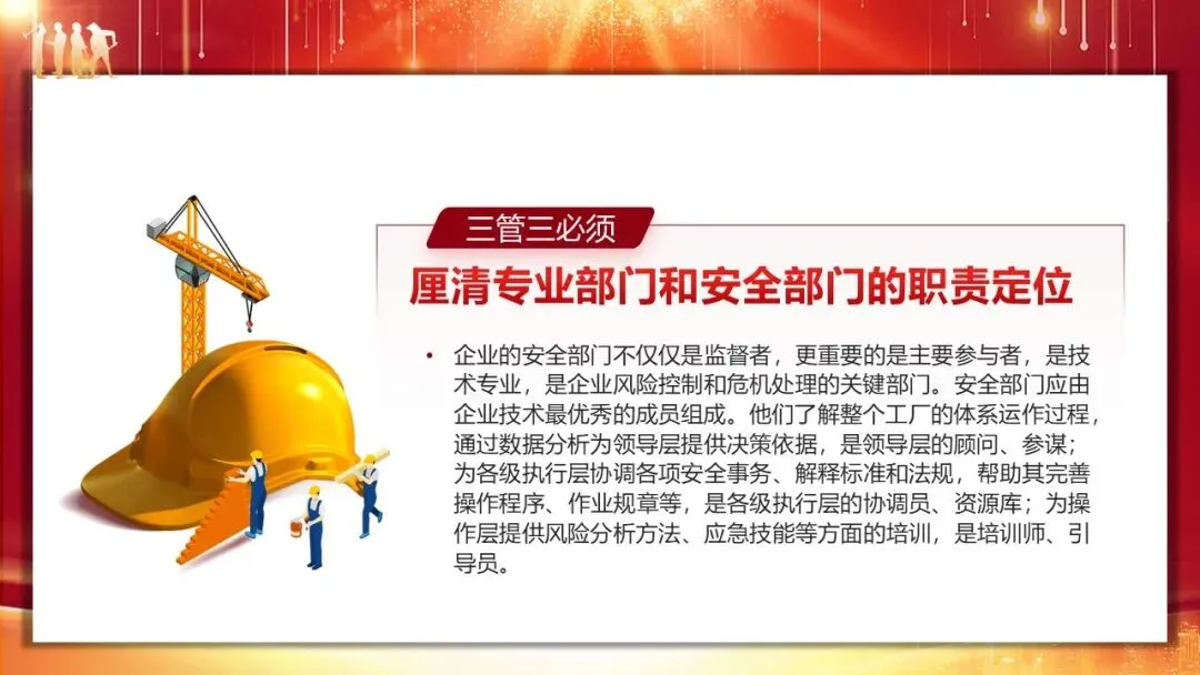落实 “三管三必须” 的核心难点在于企业专业部门安全责任的落地,具体可从三方面推进。首先要厘清专业部门与安全部门的职责定位:安全部门不仅是监督者,更是企业风险控制的技术核心、领导层的参谋、执行层的协调员和操作层的培训师,与专业部门并非领导与被领导关系,而是协同配合;专业部门则需站到风险管理和事故预防的前台,承担起本领域的安全责任。其次要树立 “一岗双责” 意识,专业部门既要做好本职工作,也要负责本专业范围内的风险识别、隐患治理、变更管理、承包商管理、事故调查及安全培训等工作,企业还需明确专业人员的安全履职能力要求,开展针对性培训并纳入能力评估。最后要掌握有效落实途径,安全部门聚焦 “不干错”,培育企业安全文化;专业部门聚焦 “干不错”,提升本质安全设计水平;同时加强专业部门组织建设、设置安全绩效考核指标,且企业班组长以上管理人员需制定个人安全行动计划,逐级分解、定期评估,确保责任落地。