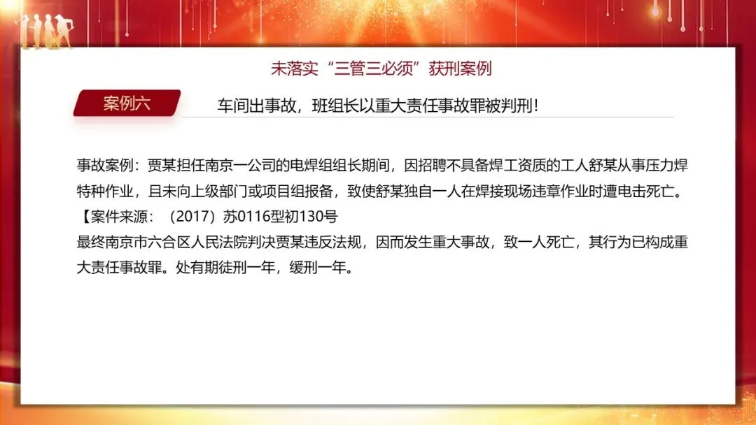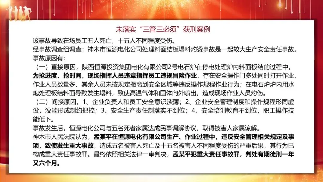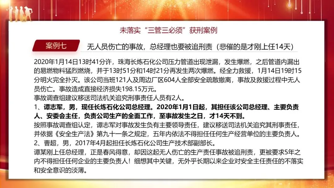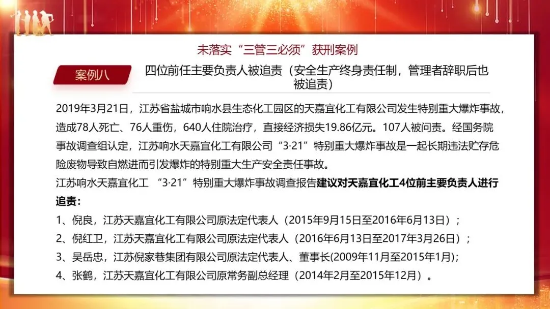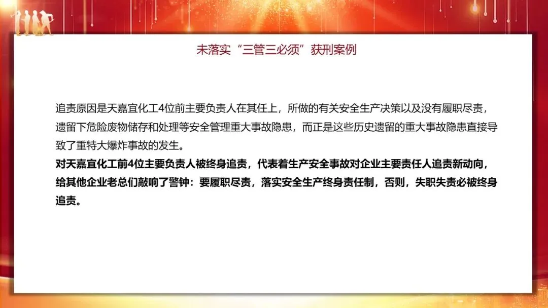 培训中通过多个典型案例,直观展现了未落实 “三管三必须” 的后果,小到岗位履职不当,大到重大事故追责,覆盖企业各管理环节。采购部门采购不合格安全网、人力部门未配齐安全员、财务部门拖延安全经费、商务部门选用资质不达标的承包单位,均违反了 “管业务必须管安全” 原则,相关负责人需承担对应责任。而在重大事故案例中,神木某电化公司车间主任违章指挥导致 5 死 15 伤,被判处有期徒刑一年六个月;南京某公司电焊班组长招聘无证人员作业致其触电身亡,被判重大责任事故罪;珠海某石化公司总经理上任 14 天,因企业安全责任落实不到位引发爆燃事故,被追刑责且 5 年内不得担任企业主要负责人。尤为值得关注的是江苏响水天嘉宜化工 “3・21” 特别重大爆炸事故,78 人死亡、直接经济损失近 20 亿元,4 位企业前主要负责人因任内遗留重大安全隐患,被终身追责,凸显了安全生产终身责任制的严肃性。