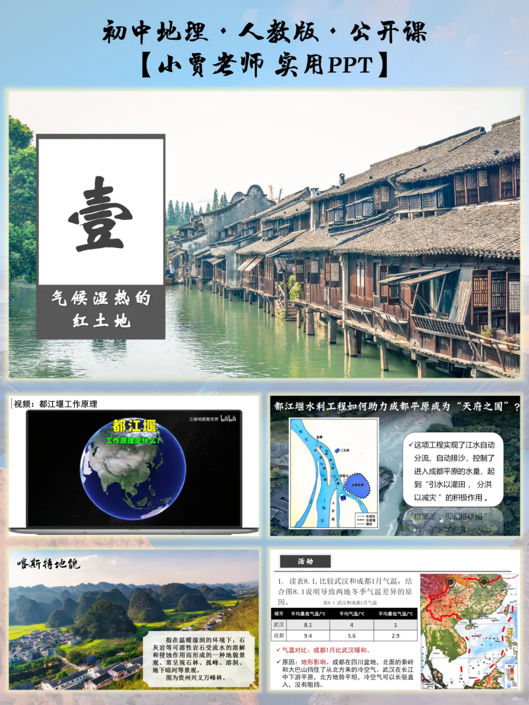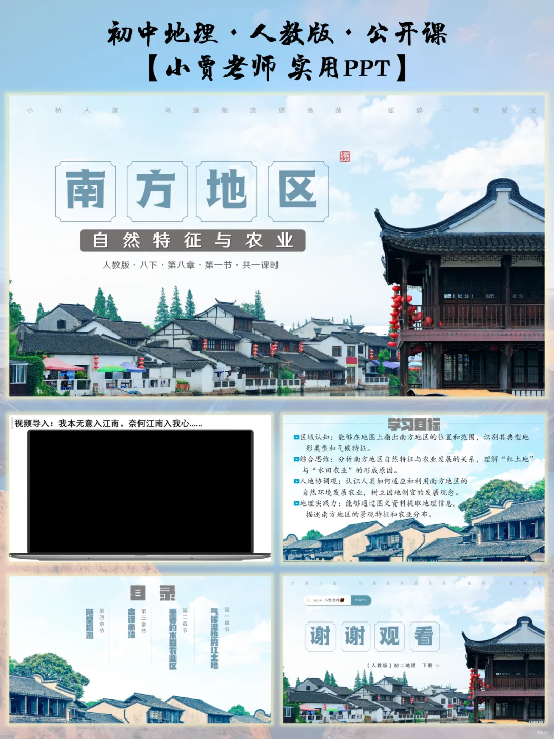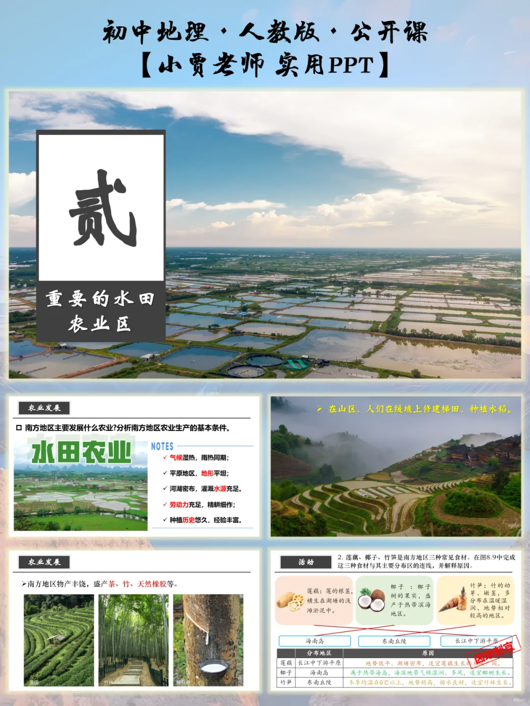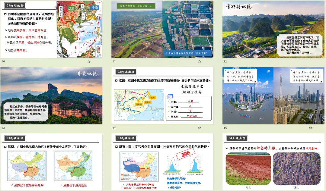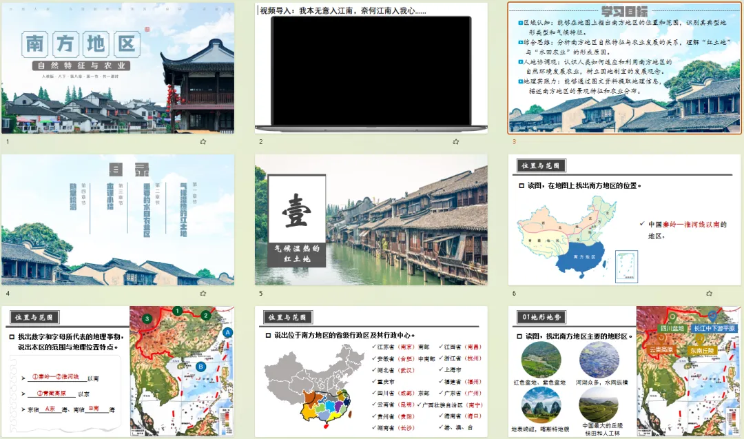 课件严格对标初中地理新课标要求,深度融合区域认知、综合思维两大核心素养。从江南水乡的河网密布到东南丘陵的红土地风情,从西南喀斯特地貌的奇特景观到南方水田农业的独特韵味,课程设计层层递进,引导学生打破碎片化记忆,真正“走进”南方地区的自然与人文环境,学会用地理视角分析区域特征。