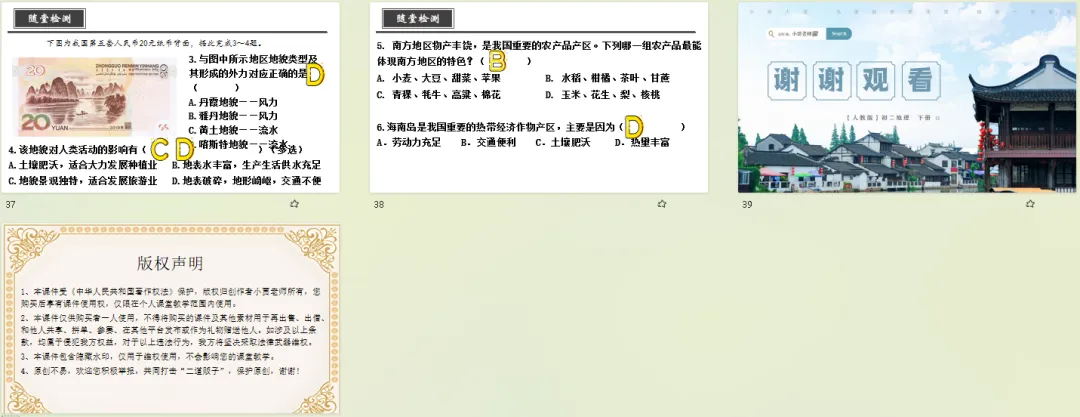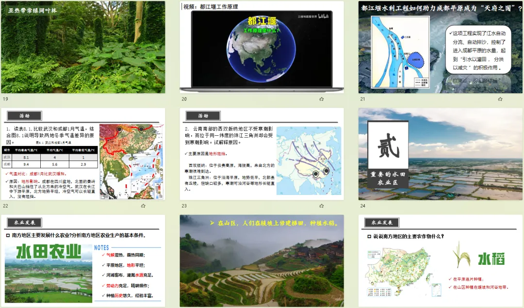 针对南方地区教学中的核心难点,比如湿热气候的成因与影响、梯田农业的分布与区位条件、喀斯特地貌的形成原理等,课件均采用“抽象概念+生活化案例”的讲解模式。比如用南方雨季的生活体验解读湿热气候,用梯田农户的生产场景分析农业特点,让原本晦涩的知识点变得通俗易懂,降低学生理解门槛。