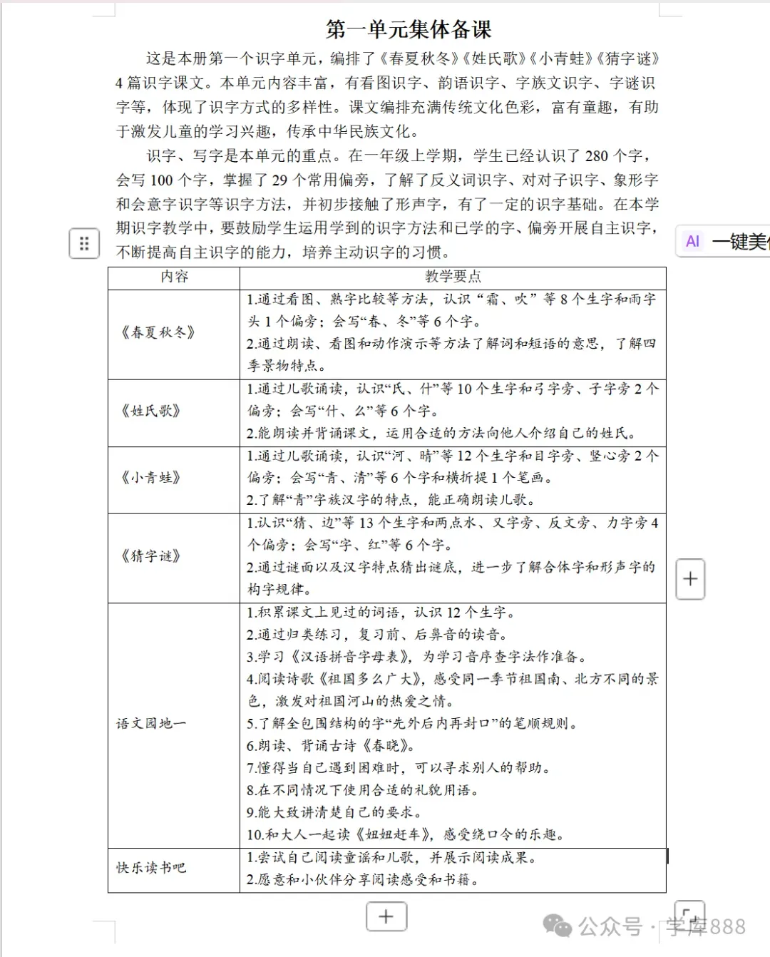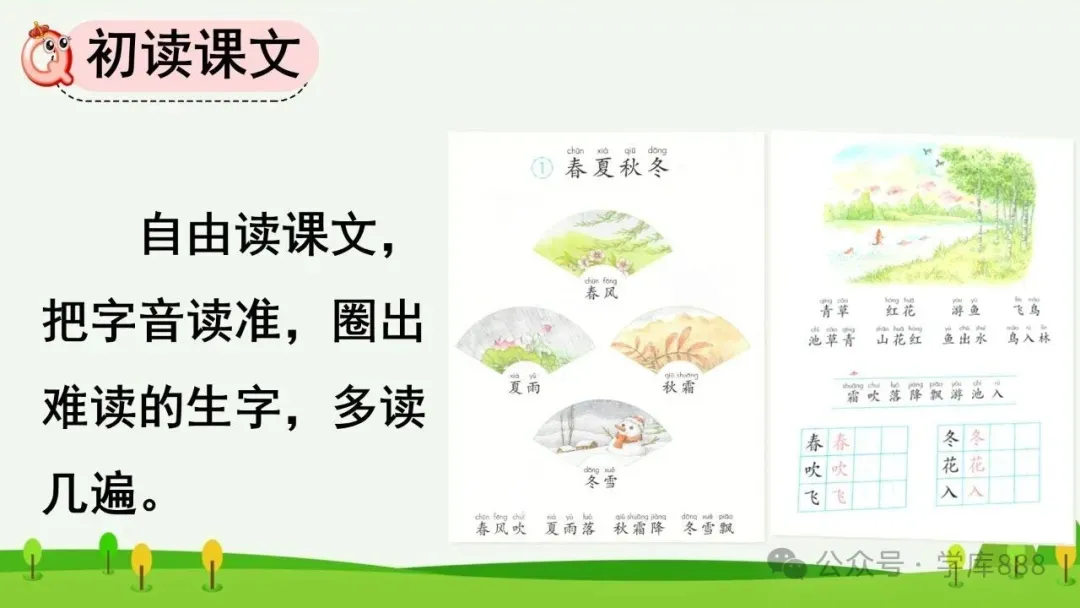 这是本册第一个识字单元,编排了《春夏秋冬》《姓氏歌》《小青蛙》《猜字谜》4篇识字课文。本单元内容丰富,有看图识字、韵语识字、字族文识字、字谜识字等,体现了识字方式的多样性。课文编排充满传统文化色彩,富有童趣,有助于激发儿童的学习兴趣,传承中华民族文化。