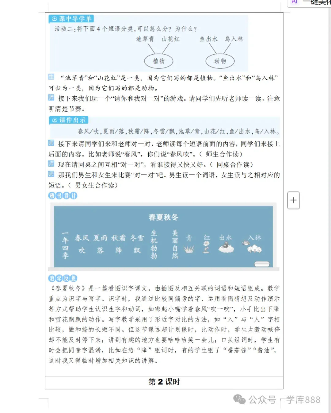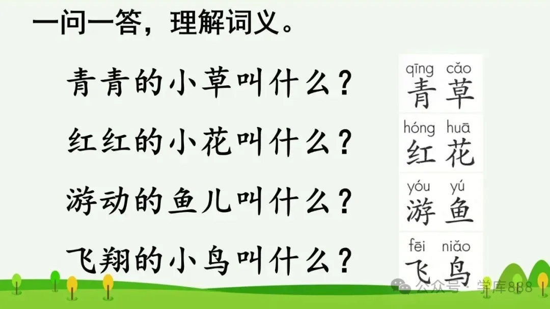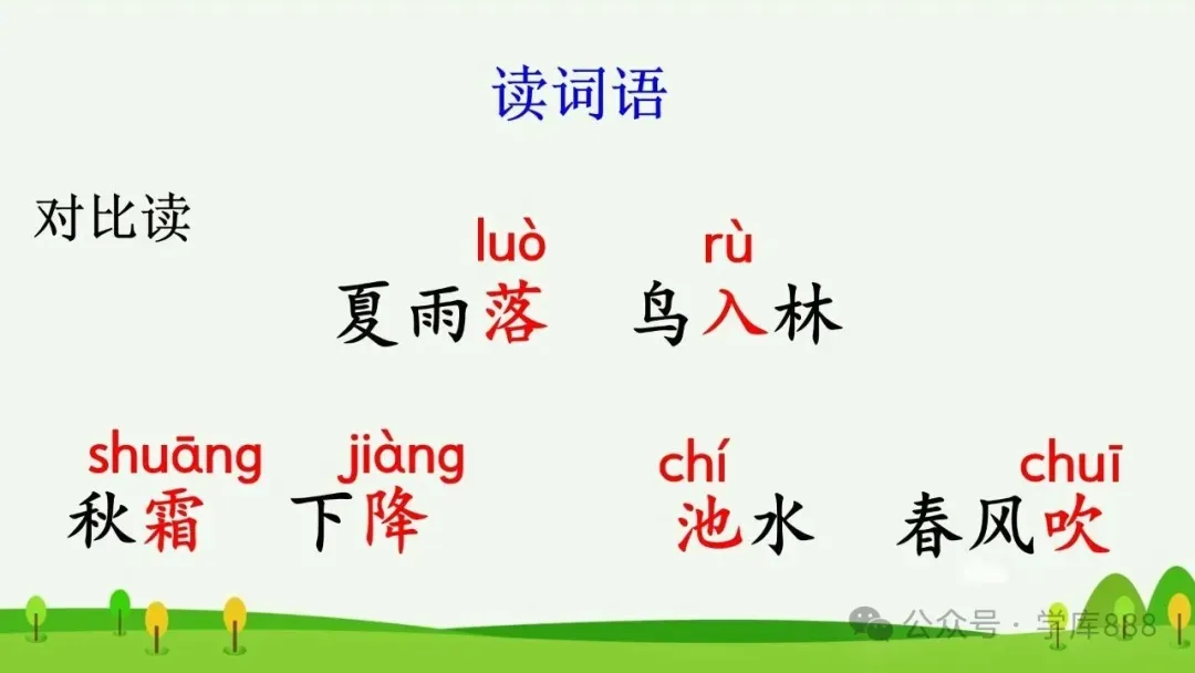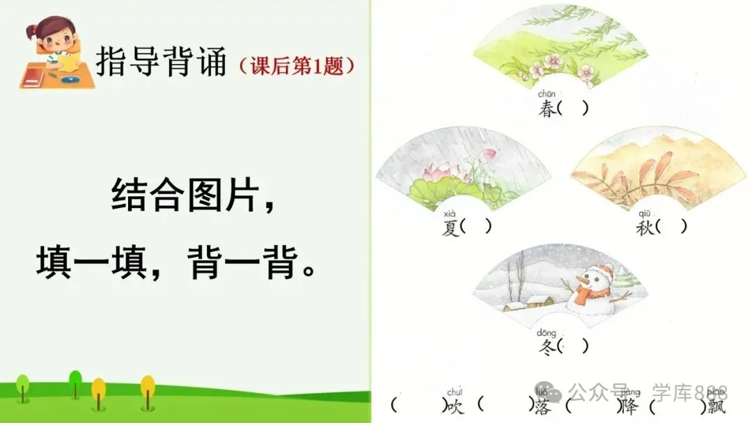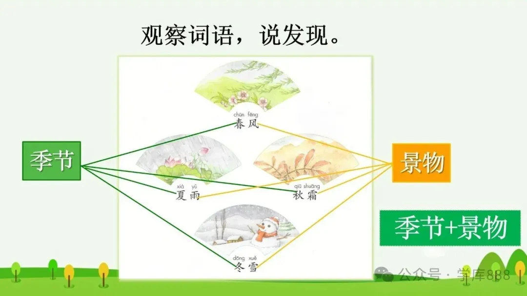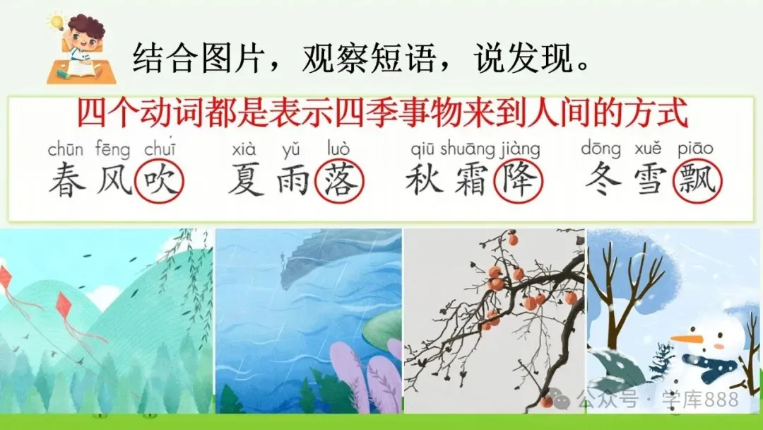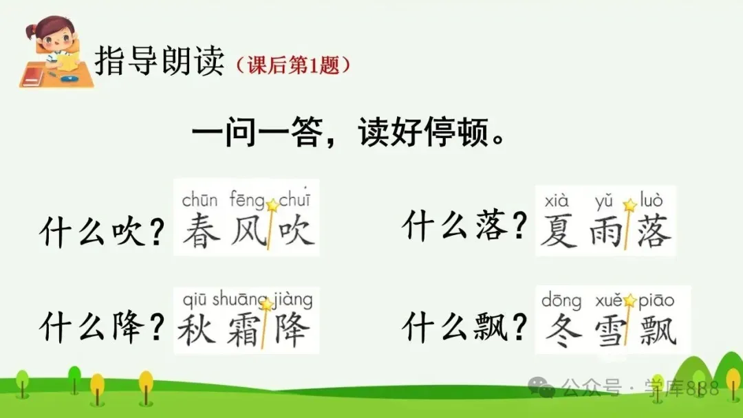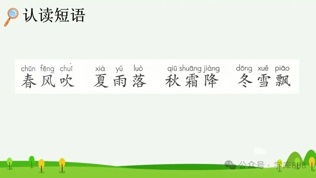 2.通过朗读、看图和动作演示等方法了解词和短语的意思,了解四季景物特点,体会四季的美好。