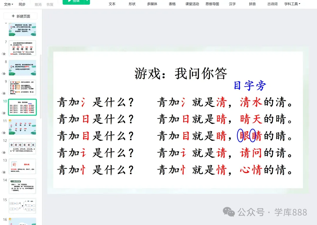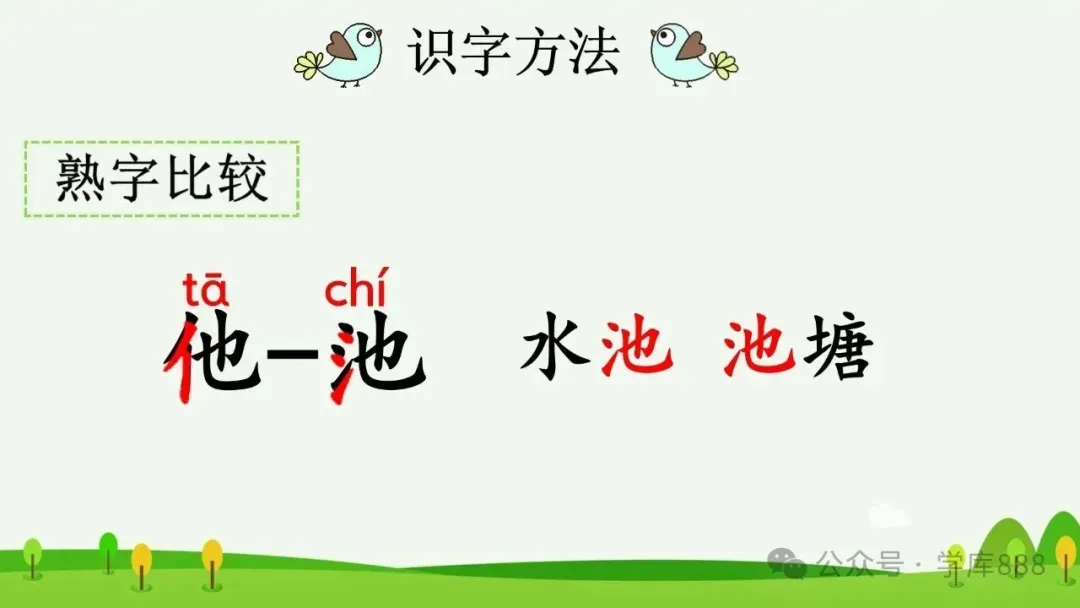 借助形声字的结构特点,运用熟字比较的方法识记8个生字。