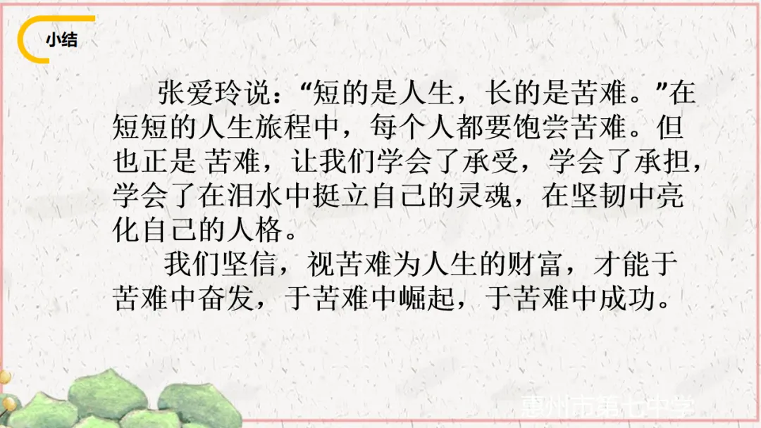 张爱玲说:“短的是人生,长的是苦难。”在短短的人生旅程中,每个人都要饱尝苦难。但也正是 苦难,让我们学会了承受,学会了承担,学会了在泪水中挺立自己的灵魂,在坚韧中亮化自己的人格。