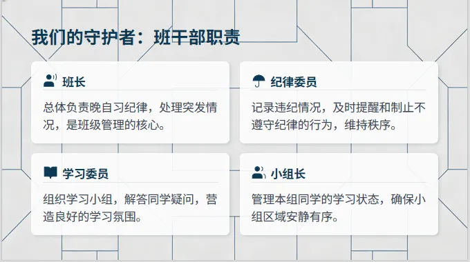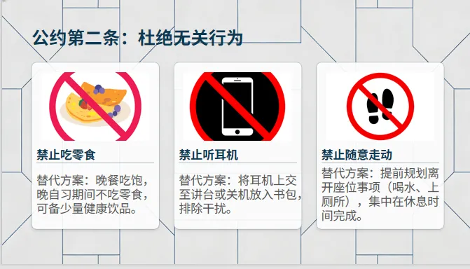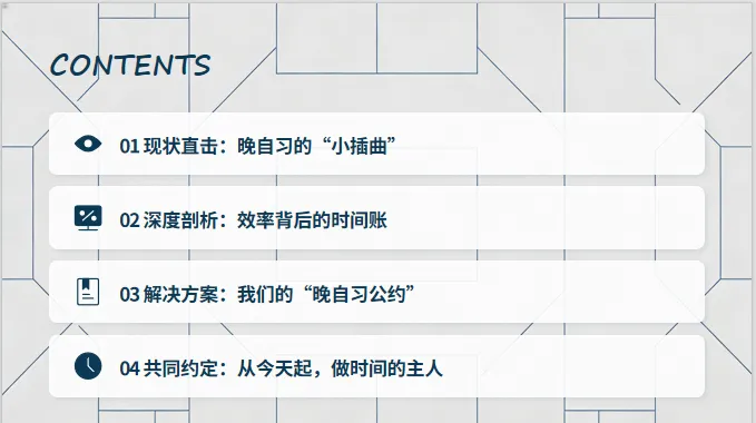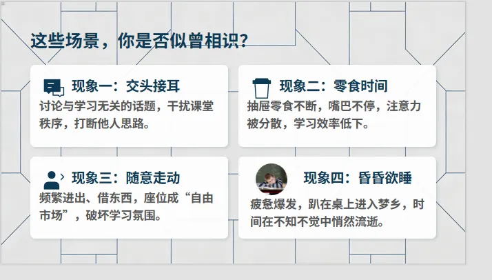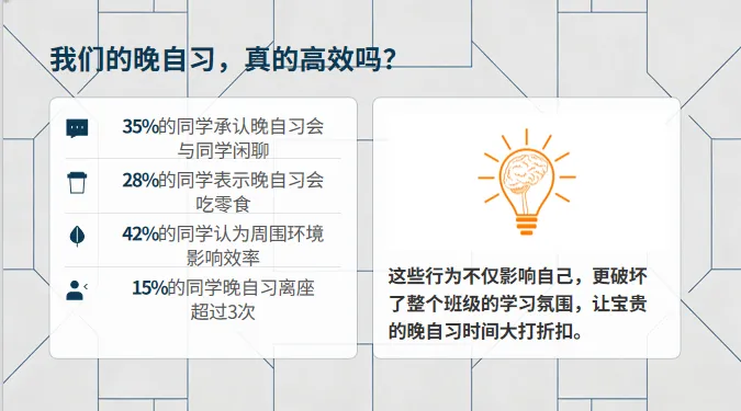 然而,老师们肯定会发现,学生在一起晚自习,难免会出现很多纪律问题。比如交头接耳,吃零食,趴桌打瞌睡,戴耳机听音乐等等,总之会有这样或那样的问题,令老师们烦恼。因此开一节班会课,来整顿晚自习纪律,提高学生晚自习效率,就非常重要了。